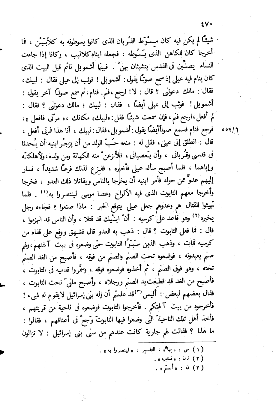 شيئا لم يكن فيه كان مسوط القربان الذي كانوا يسوطونه به كلابين، فما أخرجا كان للكاهن الذي يسوطه، فجعله ابناه كلاليب، وكانا إذا جاءت النساء يصلين في القدس يتشبثان بهن فبينما أشمويل نائم قبل البيت الذي كان ينام فيه عيلى إذ سمع صوتا يقول: أشمويل! فوثب إلى عيلى فقال: لبيك، فقال: مالك دعوتني؟ قَالَ: لا! ارجع، فنم فنام، ثم سمع صوتا آخر يقول: