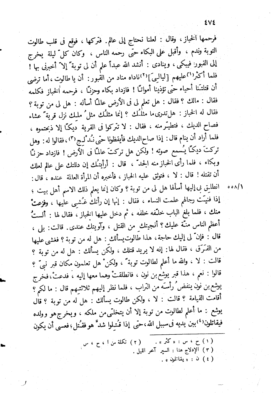 فرحمها الخباز، وقال: لعلنا نحتاج إلى عالم فتركها، فوقع في قلب طالوت التوبة وندم، وأقبل على البكاء حتى رحمه الناس، وكان كل ليلة يخرج إلى القبور فيبكي، وينادي: أنشد الله عبدا علم أن لي توبة إلا أخبرني بها! فلما أكثر عليهم ليالي ناداه مناد من القبور: أن يا طالوت، أما ترضى أن قتلتنا أحياء حتى تؤذينا أمواتا! فازداد بكاء وحزنا، فرحمه الخباز فكلمه فقال: مالك؟ فقال: هل تعلم لي في الأرض عالما أسأله: هل لي من توبة؟