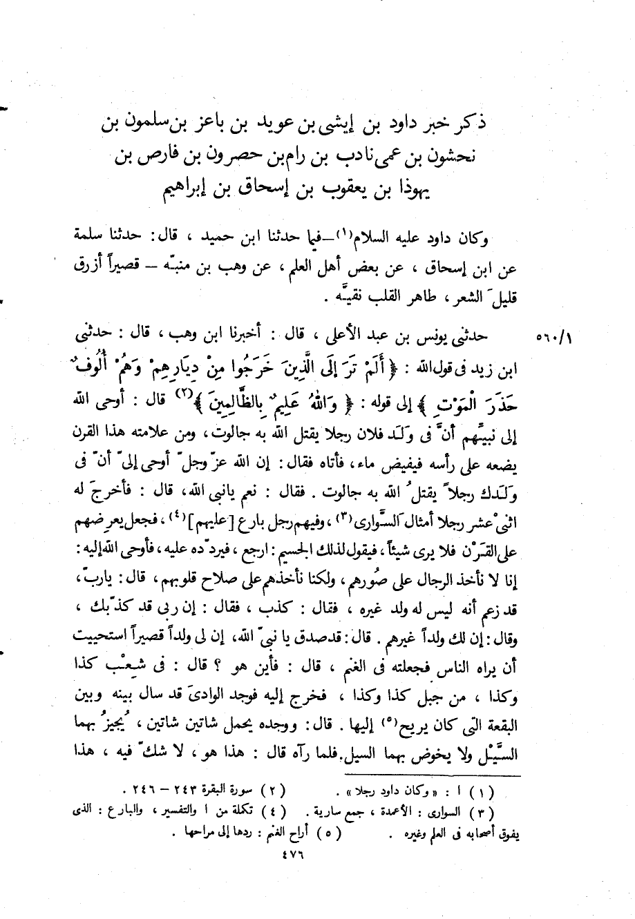 حَدَّثَنِي يُونُسُ بْنُ عَبْدِ الأَعْلَى، قَالَ: أَخْبَرَنَا ابن وهب، قال: حَدَّثَنِي ابن زيد في قول الله: «أَلَمْ تَرَ إِلَى الَّذِينَ خَرَجُوا مِنْ دِيارِهِمْ وَهُمْ أُلُوفٌ حَذَرَ الْمَوْتِ» إلى قوله: «وَاللَّهُ عَلِيمٌ بِالظَّالِمِينَ» قَالَ: أوحى الله إلى نبيهم أن في ولد فلان رجلا يقتل الله به جالوت، ومن علامته هذا القرن يضعه على رأسه فيفيض ماء، فأتاه فقال: إن الله عز وجل أوحى إلي أن في ولدك رجلا يقتل الله به جالوت فقال: نعم يا نبي الله، قَالَ: فأخرج له اثني عشر رجلا امثال السواري، وفيهم رجل بارع عليهم، فجعل يعرضهم على القرن فلا يرى شيئا، فيقول لذلك الجسيم: ارجع، فيردده عليه، فأوحى الله إليه: