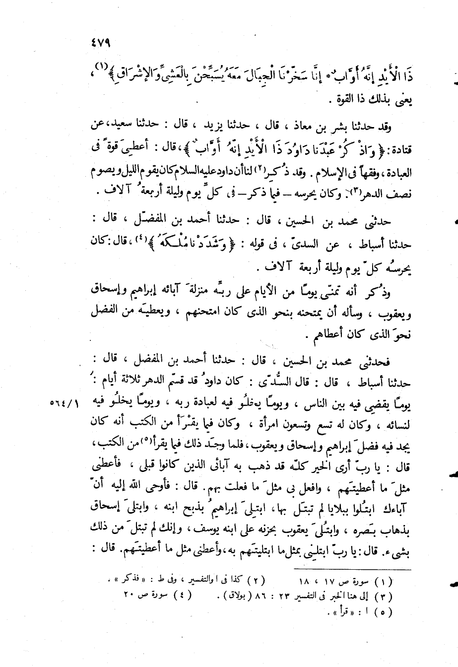 وقد حَدَّثَنَا بِشْرُ بْنُ مُعَاذٍ، قَالَ، حَدَّثَنَا يَزِيدُ، قال: حدثنا سعيد، عن قتادة: «وَاذْكُرْ عَبْدَنا داوُدَ ذَا الْأَيْدِ إِنَّهُ أَوَّابٌ» ، قَالَ: أعطي قوة في العبادة، وفقها في الاسلام وقد ذكر لنا ان داود ع كان يقوم الليل ويصوم نصف الدهر وكان يحرسه- فيما ذكر- في كل يوم وليلة أربعة آلاف.