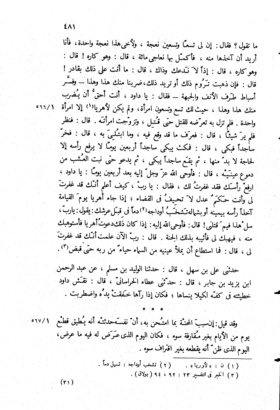 وهو كاره، قَالَ: إذا لا ندعك وذاك، قَالَ: ما أنت على ذلك بقادر! قَالَ: فإن ذهبت تروم ذلك أو تريد ذلك، ضربنا منك هذا وهذا- وفسر أسباط طرف الأنف والجبهة- فقال: يا داود، أنت أحق أن يضرب منك هذا وهذا، حيث لك تسع وتسعون امرأة، ولم يكن لاهريا إلا امرأة واحدة فلم تزل به تعرضه للقتل حتى قتل، وتزوجت امرأته قَالَ: فنظر فلم ير شيئا، قَالَ: فعرف ما قد وقع فيه، وما ابتلي به، قَالَ: فخر ساجدا فبكى، قَالَ: فمكث يبكي ساجدا أربعين يوما لا يرفع رأسه إلا لحاجة لا بد منها، ثم يقع ساجدا يبكي، ثم يدعو حتى نبت العشب من دموع عينيه، قَالَ: فأوحى الله عز وجل إليه بعد اربعين يوما: يا داود، ارفع راسك فقد غفرت لك، فقال: يا رب، كيف أعلم أنك قد غفرت لي وأنت حكم عدل لا تحيف في القضاء، إذا جاء اهريا يوم القيامة آخذا رأسه بيمينه أو بشماله تشخب أوداجه دما في قبل عرشك: يقول: يا رب، سل هذا فيم قتلني! قَالَ: فأوحى الله اليه: إذا كان ذلك دعوت اهريا فأستوهبك منه، فيهبك لي فأثيبه بذلك الجنة قَالَ: رب الآن علمت أنك قد غفرت لي، قَالَ: فما استطاع أن يملأ عينيه من السماء حياء من ربه حتى قبض حَدَّثَنِي عَلِيُّ بْن سهل، قَالَ: حَدَّثَنَا الْوَلِيد بن مسلم، عن عبد الرحمن ابن يزيد بن جابر، قَالَ: حَدَّثَنِي عطاء الخراساني، قَالَ: نقش داود خطيئته في كفه لكيلا ينساها، فكان إذا رآها خفقت يده واضطربت.