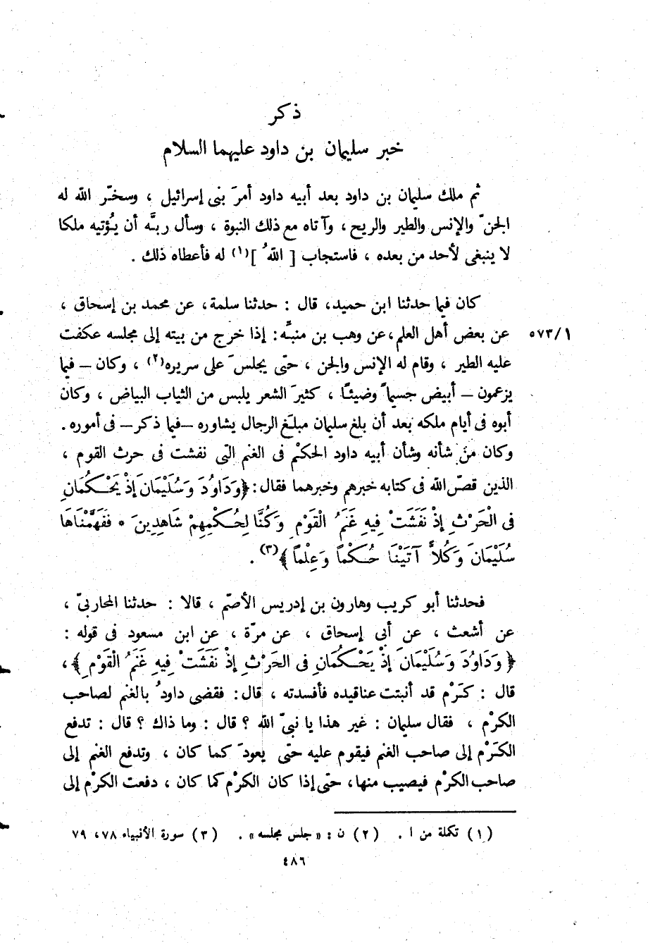 «وَداوُدَ وَسُلَيْمانَ إِذْ يَحْكُمانِ فِي الْحَرْثِ إِذْ نَفَشَتْ فِيهِ غَنَمُ الْقَوْمِ» ، قَالَ: كَرْمٌ قَدْ أَنْبَتَتْ عَنَاقِيدُهُ فَأَفْسَدَتْهُ، قَالَ: فَقَضَى دَاوُدُ بِالْغَنَمِ لِصَاحِبِ الْكَرْمِ، فَقَالَ سُلَيْمَانُ: غَيْرَ هَذَا يَا نَبِيَّ اللَّهِ؟ قَالَ: وَمَا ذَاكَ؟ قَالَ: تَدْفَعُ الْكَرْمَ إِلَى صَاحِبِ الْغَنَمِ فَيَقُومُ عَلَيْهِ حَتَّى يَعُودَ كَمَا كَانَ، وَتَدْفَعُ الْغَنَمِ إِلَى صَاحِبِ الْكَرْمِ فَيُصِيبُ مِنْهَا، حَتَّى إِذَا كَانَ الْكَرْمُ كَمَا كَانَ، دَفَعْتَ الْكَرْمَ الى