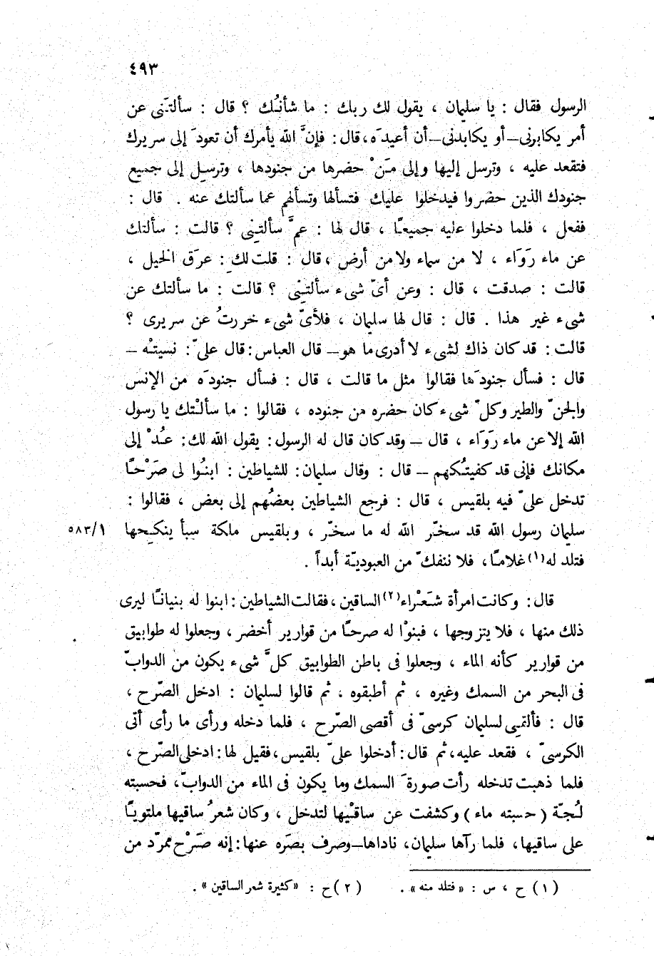 قَالَ: وَكَانَتِ امْرَأَةً شَعْرَاءَ السَّاقَيْنِ، فَقَالَتِ الشَّيَاطِينُ: ابْنُوا لَهُ بُنْيَانًا لِيَرَى ذَلِكَ مِنْهَا، فَلا يَتَزَوَّجُهَا، فَبَنَوْا لَهُ صَرْحًا مِنْ قَوَارِيرَ أَخْضَرَ، وَجَعَلُوا لَهُ طَوَابِيقَ مِنْ قَوَارِيرَ كَأَنَّهُ الْمَاءُ، وَجَعَلُوا فِي بَاطِنِ الطَّوَابِيقِ كُلَّ شَيْءٍ يَكُونُ مِنَ الدَّوَابِّ فِي الْبَحْرِ مِنَ السَّمَكِ وَغَيْرِهِ، ثُمَّ أَطْبَقُوهُ، ثُمَّ قَالُوا لِسُلَيْمَانَ: ادْخُلِ الصَّرْحَ، قَالَ: فَأُلْقِيَ لِسُلَيْمَانَ كُرْسِيٌّ فِي أَقْصَى الصَّرْحِ، فَلَمَّا دَخَلَهُ وَرَأَى مَا رَأَى أَتَى الْكُرْسِيَّ، فَقَعَدَ عَلَيْهِ، ثُمَّ قَالَ: أَدْخِلُوا عَلَيَّ بِلْقِيسَ، فَقِيلَ لَهَا: ادْخُلِي الصَّرْحَ، فَلَمَّا ذَهَبَتْ تَدْخُلُهُ رَأَتْ صُورَةَ السَّمَكِ وَمَا يَكُونُ فِي الْمَاءِ مِنَ الدَّوَابِّ، فَحَسِبَتْهُ لُجَّةً حسبته ماء وكشفت عن ساقيها لِتَدْخُلَ، وَكَانَ شَعْرُ سَاقَيْهَا مُلْتَوِيًا عَلَى سَاقَيْهَا، فَلَمَّا رَآهَا سُلَيْمَانُ، نَادَاهَا- وَصَرَفَ بَصَرَهُ عَنْهَا: انه صرح ممرد من