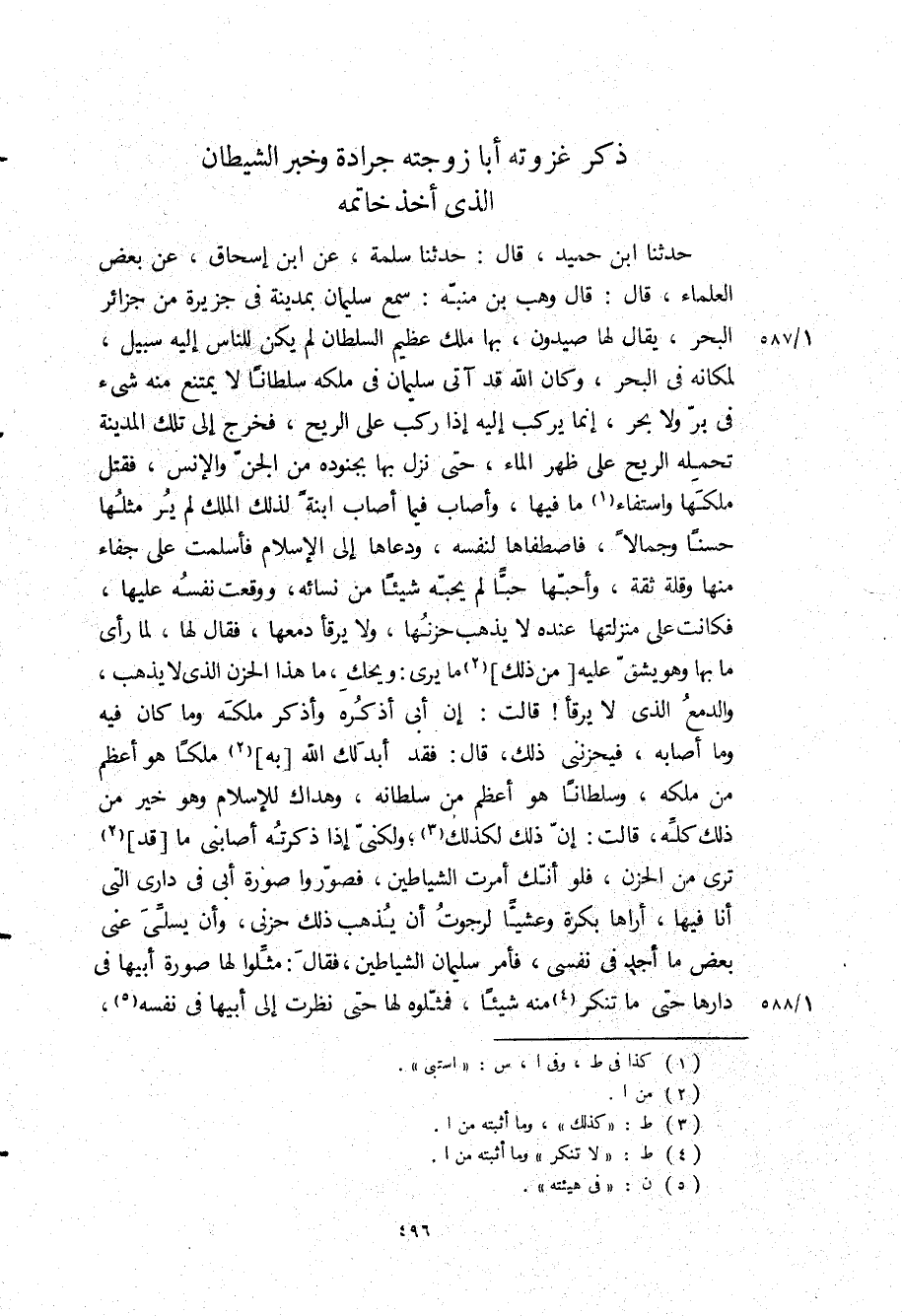 حَدَّثَنَا ابن حميد، قَالَ: حَدَّثَنَا سلمة، عن ابن إسحاق، عن بعض العلماء، قَالَ: قَالَ وهب بن منبه: سمع سليمان بمدينة في جزيرة من جزائر البحر، يقال لها صيدون، بها ملك عظيم السلطان لم يكن للناس اليه سبيل، لمكانه في البحر، وكان الله قد آتى سليمان في ملكه سلطانا لا يمتنع منه شيء في بر ولا بحر، إنما يركب إليه إذا ركب على الريح، فخرج إلى تلك المدينة تحمله الريح على ظهر الماء، حتى نزل بها بجنوده من الجن والإنس، فقتل ملكها واستفاء ما فيها، وأصاب فيما أصاب ابنة لذلك الملك لم ير مثلها حسنا وجمالا، فاصطفاها لنفسه، ودعاها إلى الإسلام فأسلمت على جفاء منها وقلة ثقة، وأحبها حبا لم يحبه شيئا من نسائه، ووقعت نفسه عليها، فكانت على منزلتها عنده لا يذهب حزنها، ولا يرقأ دمعها، فقال لها، لما رأى ما بها وهو يشق عليه من ذلك ما يرى: ويحك، ما هذا الحزن الذي لا يذهب، والدمع الذي لا يرقأ! قالت: إن أبي أذكره وأذكر ملكه وما كان فيه وما أصابه، فيحزنني ذلك، قَالَ: فقد ابد لك الله به ملكا هو أعظم من ملكه، وسلطانا هو أعظم من سلطانه، وهداك للإسلام وهو خير من ذلك كله، قالت: إن ذلك لكذلك، ولكني إذا ذكرته أصابني ما قد ترى من الحزن، فلو أنك أمرت الشياطين، فصوروا صورة أبي في داري التي أنا فيها، أراها بكرة وعشيا لرجوت أن يذهب ذلك حزني، وأن يسلي عني بعض ما أجد في نفسي، فأمر سليمان الشياطين، فقال: مثلوا لها صوره أبيها في دارها حتى ما تنكر منه شيئا، فمثلوه لها حتى نظرت إلى أبيها في نفسه،