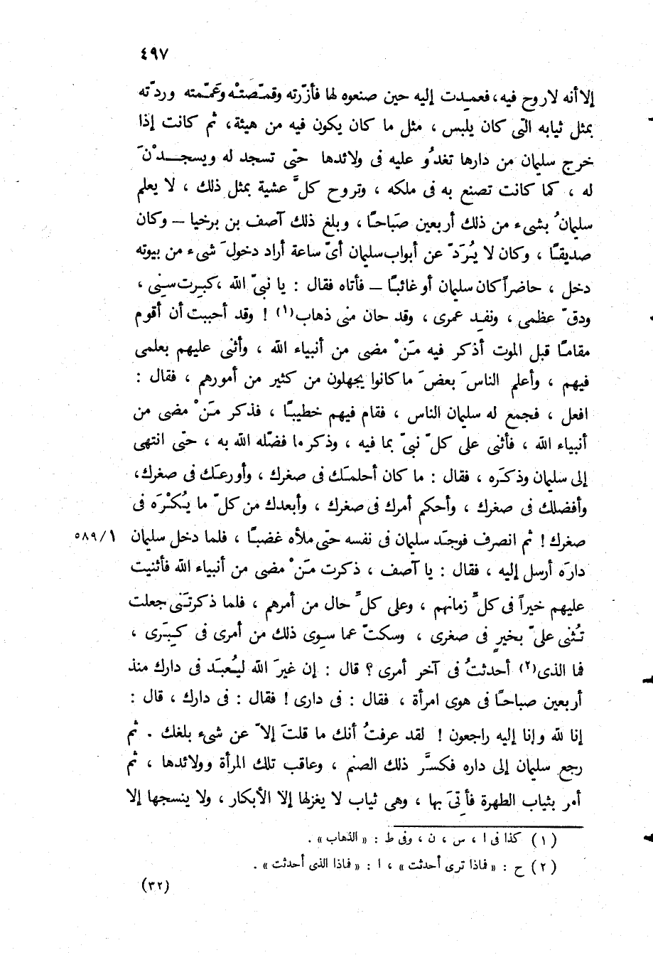 افعل، فجمع له سليمان الناس، فقام فيهم خطيبا، فذكر من مضى من أنبياء الله، فأثنى على كل نبي بما فيه، وذكر ما فضله الله به، حتى انتهى الى سليمان وذكره، فقال: ما كان احملك في صغرك، وأورعك في صغرك، وأفضلك في صغرك، وأحكم أمرك في صغرك، وأبعدك من كل ما يكره في صغرك! ثم انصرف فوجد سليمان في نفسه حتى ملأه غضبا، فلما دخل سليمان داره أرسل إليه، فقال: يا آصف، ذكرت من مضى من أنبياء الله فأثنيت عليهم خيرا في كل زمانهم، وعلى كل حال من أمرهم، فلما ذكرتني جعلت تثني علي بخير في صغري، وسكت عما سوى ذلك من أمري في كبري، فما الذي أحدثت في آخر أمري؟ قَالَ: إن غير الله ليعبد في دارك منذ أربعين صباحا في هوى امرأة، فقال: في دارى! فقال: في دارك، قَالَ:
