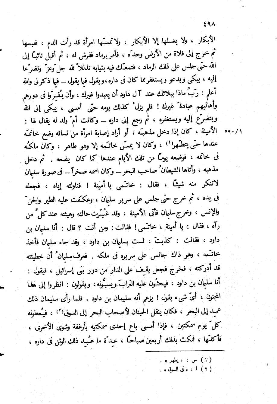 الأمينة، كان إذا دخل مذهبه، أو أراد إصابة امرأة من نسائه وضع خاتمه عندها حتى يتطهر، وكان لا يمس خاتمه إلا وهو طاهر، وكان ملكه في خاتمه، فوضعه يوما من تلك الأيام عندها كما كان يضعه ثم دخل مذهبه، وأتاها الشيطان صاحب البحر- وكان اسمه صخرا- في صورة سليمان لا تنكر منه شيئا، فقال: خاتمي يا أمينة! فناولته إياه، فجعله في يده، ثم خرج حتى جلس على سرير سليمان، وعكفت عليه الطير والجن والإنس، وخرج سليمان فأتى الأمينة، وقد غيرت حالته وهيئته عند كل من رآه، فقال: يا أمينة، خاتمي! فقالت: ومن أنت؟ قَالَ: أنا سليمان بن داود، فقالت: كذبت، لست بسليمان بن داود، وقد جاء سليمان فأخذ خاتمه، وهو ذاك جالس على سريره في ملكه فعرف سليمان أن خطيئته قد أدركته، فخرج فجعل يقف على الدار من دور بني إسرائيل، فيقول: