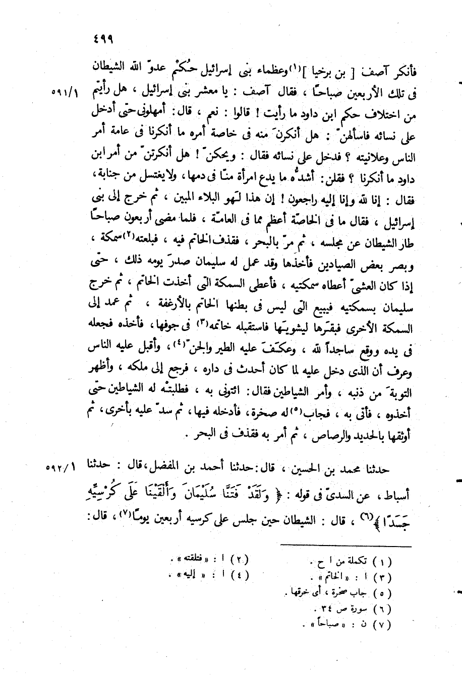 حَدَّثَنَا مُحَمَّد بْنُ الْحُسَيْنِ، قَالَ: حَدَّثَنَا أَحْمَدُ بْنُ الْمُفَضَّلِ، قَالَ: حَدَّثَنَا أَسْبَاطٌ، عَنِ السُّدِّيِّ في قوله: «وَلَقَدْ فَتَنَّا سُلَيْمانَ وَأَلْقَيْنا عَلى كُرْسِيِّهِ جَسَداً» ، قَالَ: الشيطان حين جلس على كرسيه أربعين يوما، قال: