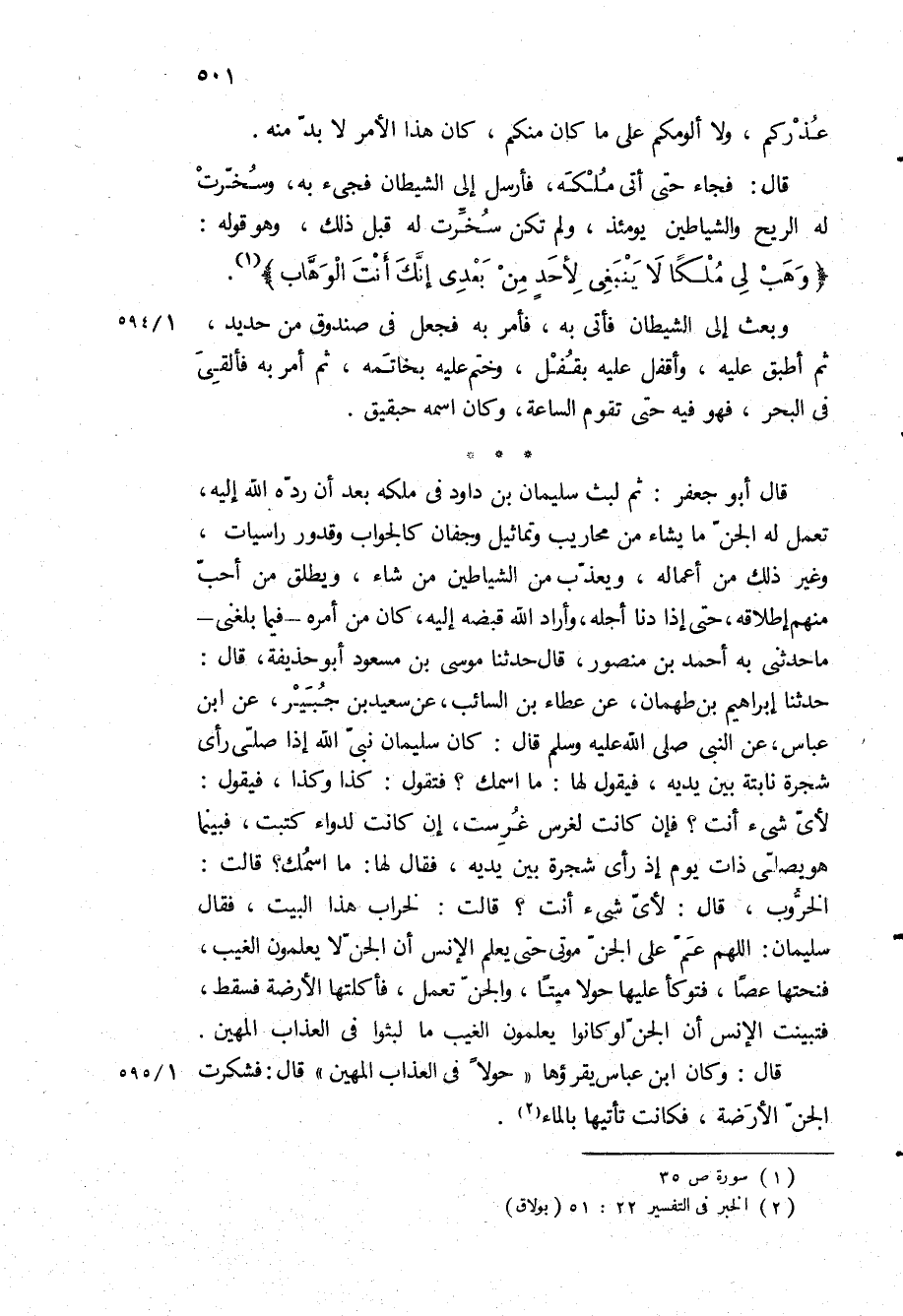 قال ابو جعفر: ثم لبث سليمان بن داود في ملكه بعد أن رده الله إليه، تعمل له الجن مَا يَشَاءُ مِنْ مَحَارِيبَ وتماثيل وجفان كالجواب وقدور راسيات، وغير ذلك من أعماله، ويعذب من الشياطين من شاء، ويطلق من أحب منهم إطلاقه، حتى إذا دنا أجله، وأراد الله قبضه إليه، كان من أمره- فيما بلغني- ما حَدَّثَنِي بِهِ أَحْمَدُ بْنُ مَنْصُورٍ، قَالَ حَدَّثَنَا مُوسَى بْنُ مَسْعُودٍ أَبُو حُذَيْفَةَ، قَالَ: