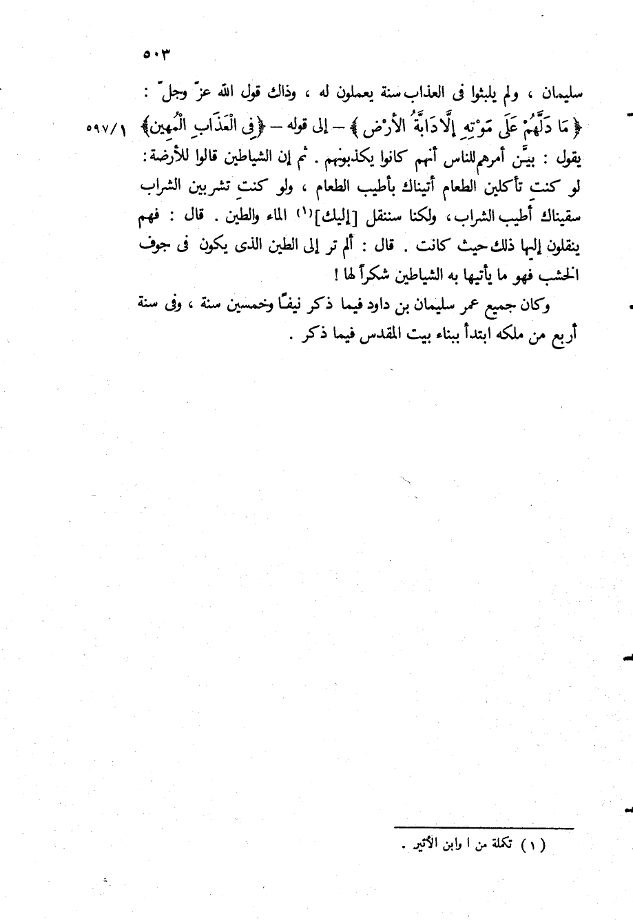 لَوْ كُنْتِ تَأْكُلِينَ الطَّعَامَ أَتَيْنَاكِ بِأَطْيَبِ الطَّعَامِ، وَلَوْ كُنْتِ تَشْرَبِينَ الشَّرَابَ سَقَيْنَاكِ أَطْيَبَ الشَّرَابِ، وَلَكِنَّا سَنَنْقُلُ إِلَيْكِ الْمَاءَ وَالطِّينَ قَالَ: فَهُمْ يَنْقُلُونَ إِلَيْهَا ذَلِكَ حَيْثُ كَانَتْ قَالَ: أَلَمْ تَرَ إِلَى الطِّينِ الَّذِي يَكُونُ فِي جَوْفِ الْخَشَبِ فَهُوَ مَا يَأْتِيهَا بِهِ الشَّيَاطِينُ شُكْرًا لَهَا! وَكَانَ جَمِيعُ عُمْرِ سُلَيْمَانَ بْنِ دَاوُدَ فِيمَا ذُكِرَ نَيِّفًا وَخَمْسِينَ سَنَةً، وَفِي سَنَةِ أَرْبَعٍ مِنْ مُلْكِهِ ابْتَدَأَ بِبِنَاءِ بَيْتِ الْمَقْدِسِ فِيمَا ذُكِرَ