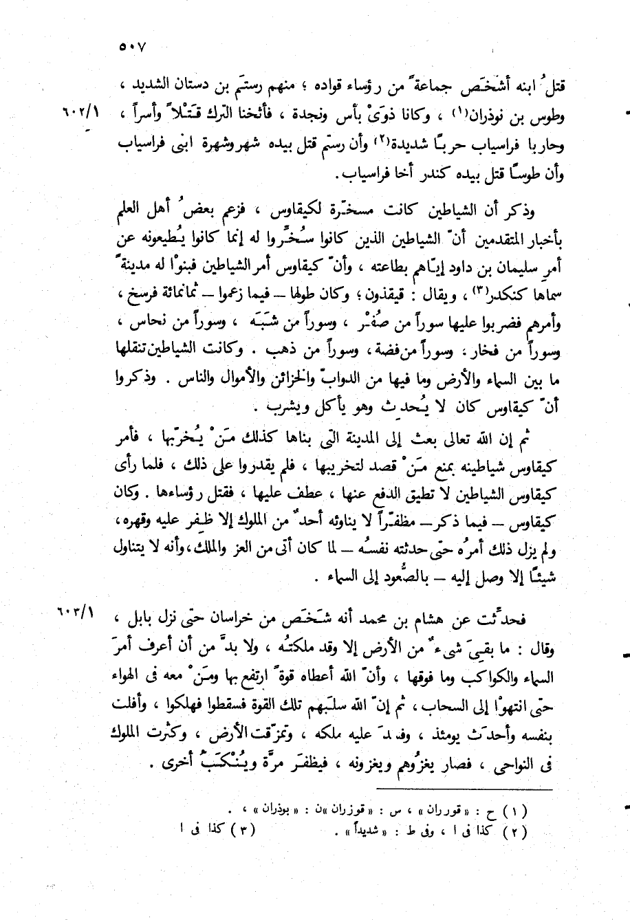 فحدثت عن هشام بن مُحَمَّد أنه شخص من خراسان حتى نزل بابل، وقال: ما بقي شيء من الأرض إلا وقد ملكته، ولا بد من أن أعرف أمر السماء والكواكب وما فوقها، وأن الله أعطاه قوة ارتفع بها ومن معه في الهواء حتى انتهوا إلى السحاب، ثم إن الله سلبهم تلك القوة فسقطوا فهلكوا، وأفلت بنفسه وأحدث يومئذ، وفسد عليه ملكه، وتمزقت الأرض، وكثرت الملوك في النواحي، فصار يغزوهم ويغزونه، فيظفر مرة وينكب اخرى