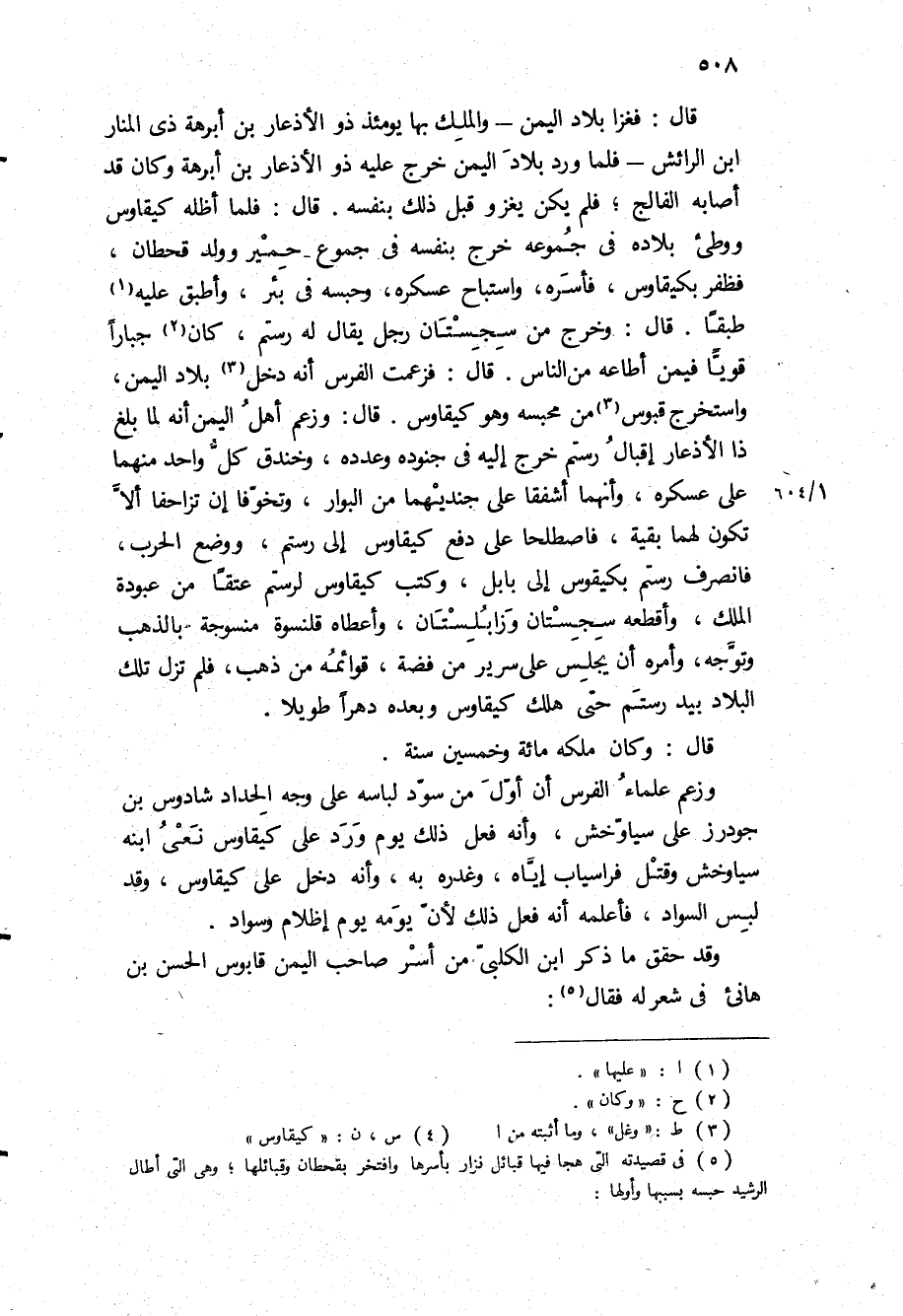 قَالَ: فغزا بلاد اليمن- والملك بها يومئذ ذو الاذعار بن أبرهة ذي المنار ابن الرائش- فلما ورد بلاد اليمن خرج عليه ذو الأذعار بن أبرهة وكان قد أصابه الفالج، فلم يكن يغزو قبل ذلك بنفسه قال: فلما اظله كيقاوس ووطيء بلاده في جموعه خرج بنفسه في جموع حمير وولد قحطان، فظفر بكيقاوس، فأسره، واستباح عسكره، وحبسه في بئر، وأطبق عليه طبقا قَالَ: وخرج من سجستان رجل يقال له رستم، كان جبارا قويا فيمن أطاعه من الناس قال: فزعمت الفرس انه دخل بلاد اليمن، واستخرج قبوس من محبسه وهو كيقاوس قَالَ: وزعم أهل اليمن أنه لما بلغ ذا الأذعار إقبال رستم خرج اليه في جنوده وعدده، وخندق كل واحد منهما على عسكره، وأنهما أشفقا على جنديهما من البوار، وتخوفا ان تزاحفا ألا تكون لهما بقية، فاصطلحا على دفع كيقاوس إلى رستم، ووضع الحرب، فانصرف رستم بكيقوس إلى بابل، وكتب كيقاوس لرستم عتقا من عبودة الملك، وأقطعه سجستان وزابلستان، وأعطاه قلنسوة منسوجة بالذهب وتوجه، وأمره أن يجلس على سرير من فضة، قوائمه من ذهب، فلم تزل تلك البلاد بيد رستم حتى هلك كيقاوس وبعده دهرا طويلا.