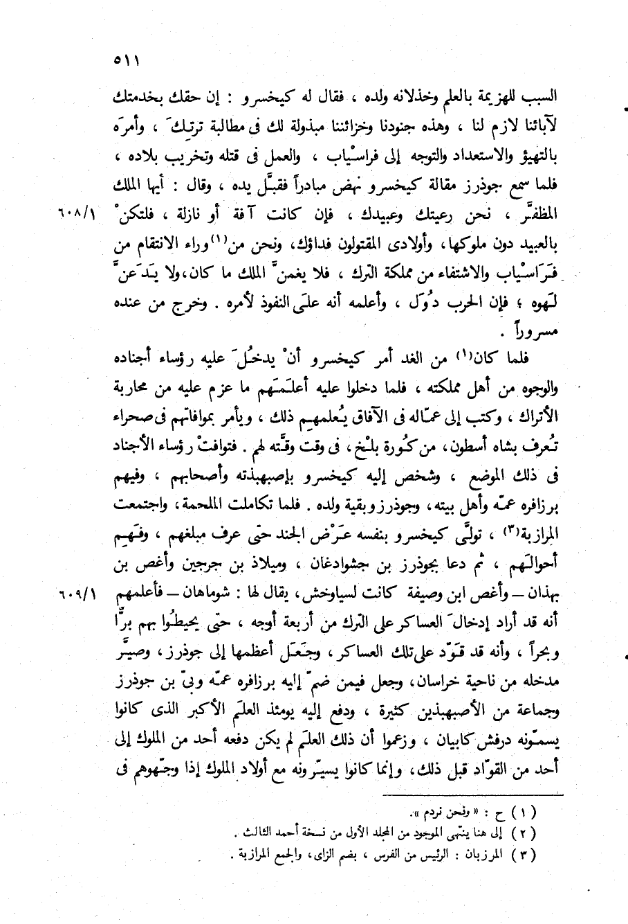 السبب للهزيمة بالعلم وخذلانه ولده، فقال له كيخسرو: إن حقك بخدمتك لآبائنا لازم لنا، وهذه جنودنا وخزائننا مبذولة لك في مطالبة ترتك، وامره بالتهيؤ والاستعداد والتوجه الى فراسياب، والعمل في قتله وتخريب بلاده، فلما سمع جوذرز مقالة كيخسرو نهض مبادرا فقبل يده، وقال: أيها الملك المظفر، نحن رعيتك وعبيدك، فإن كانت آفة أو نازلة، فلتكن بالعبيد دون ملوكها، وأولادي المقتولون فداؤك، ونحن من وراء الانتقام من فراسياب والاشتفاء من مملكة الترك، فلا يغمن الملك ما كان، ولا يدعن لهوه، فإن الحرب دول، وأعلمه أنه على النفوذ لأمره وخرج من عنده مسرورا.