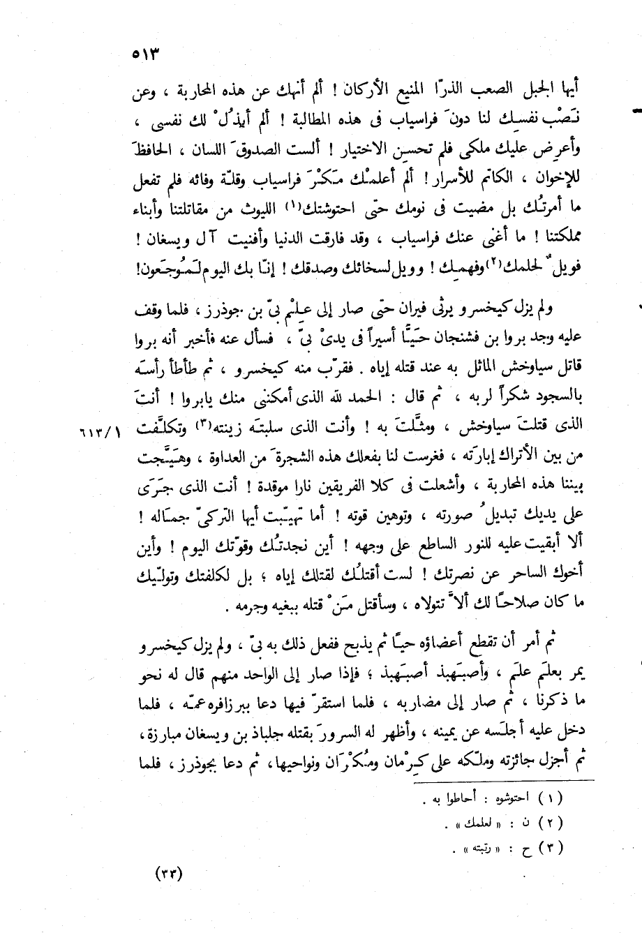 أيها الجبل الصعب الذرا المنيع الأركان! ألم أنهك عن هذه المحاربة، وعن نصب نفسك لنا دون فراسياب في هذه المطالبة! ألم أبذل لك نفسي، وأعرض عليك ملكي فلم تحسن الاختيار! ألست الصدوق اللسان، الحافظ للإخوان، الكاتم للأسرار! ألم اعلمك مكر فراسياب وقلة وفائه فلم تفعل ما أمرتك بل مضيت في نومك حتى احتوشتك الليوث من مقاتلتنا وأبناء مملكتنا! ما اغنى عنك فراسياب، وقد فارقت الدنيا وأفنيت آل ويسغان! فويل لحلمك وفهمك! وويل لسخائك وصدقك! إنا بك اليوم لموجعون! ولم يزل كيخسرو يرثي فيران حتى صار إلى علم بي بن جوذرز، فلما وقف عليه وجد بروا بن فشنجان حيا أسيرا في يدي بي، فسأل عنه فأخبر أنه بروا قاتل سياوخش الماثل به عند قتله إياه فقرب منه كيخسرو، ثم طأطأ رأسه بالسجود شكرا لربه، ثم قَالَ: الحمد لله الذي أمكنني منك يا بروا! أنت الذي قتلت سياوخش، ومثلت به! وأنت الذي سلبته زينته وتكلفت من بين الأتراك إبارته، فغرست لنا بفعلك هذه الشجرة من العداوة، وهيجت بيننا هذه المحاربة، وأشعلت في كلا الفريقين نارا موقدة! أنت الذي جرى على يديك تبديل صورته، وتوهين قوته! أما تهيبت أيها التركي جماله! ألا أبقيت عليه للنور الساطع على وجهه! أين نجدتك وقوتك اليوم! وأين أخوك الساحر عن نصرتك! لست أقتلك لقتلك إياه، بل لكلفتك وتوليك ما كان صلاحا لك ألا تتولاه، وسأقتل من قتله ببغيه وجرمه.