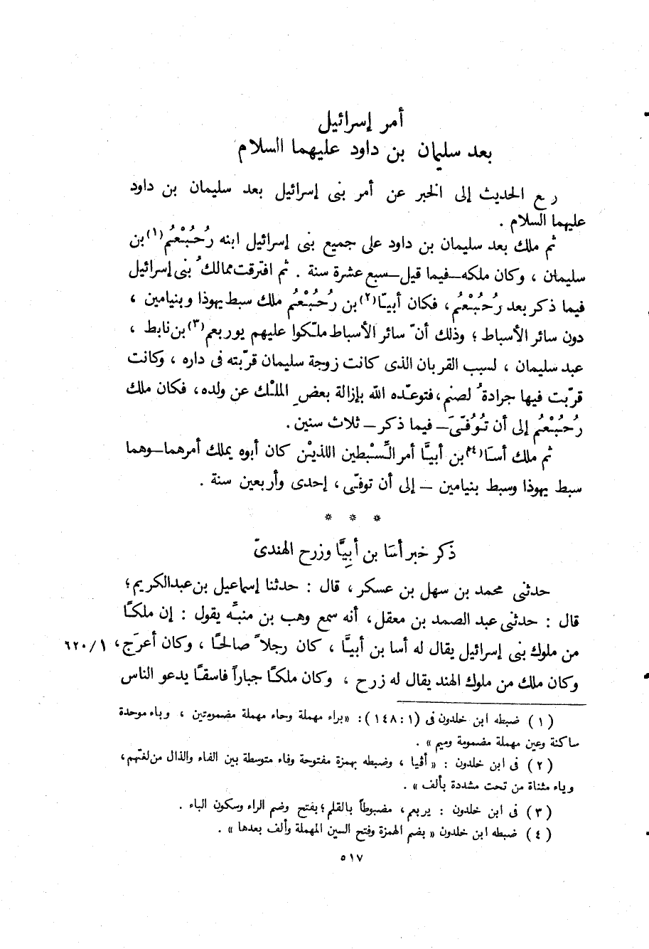 ثم ملك بعد سليمان بن داود على جميع بني إسرائيل ابنه رحبعم بن سليمان، وكان ملكه- فيما قيل- سبع عشرة سنة ثم افترقت ممالك بني إسرائيل فيما ذكر بعد رحبعم، فكان أبيا بن رحبعم ملك سبط يهوذا وبنيامين، دون سائر الأسباط، وذلك أن سائر الأسباط ملكوا عليهم يوربعم بن نابط، عبد سليمان، لسبب القربان الذي كانت زوجة سليمان قربته في داره، وكانت قربت فيها جرادة لصنم، فتوعده الله بإزالة بعض الملك عن ولده، فكان ملك رحبعم إلى أن توفي- فيما ذكر- ثلاث سنين.