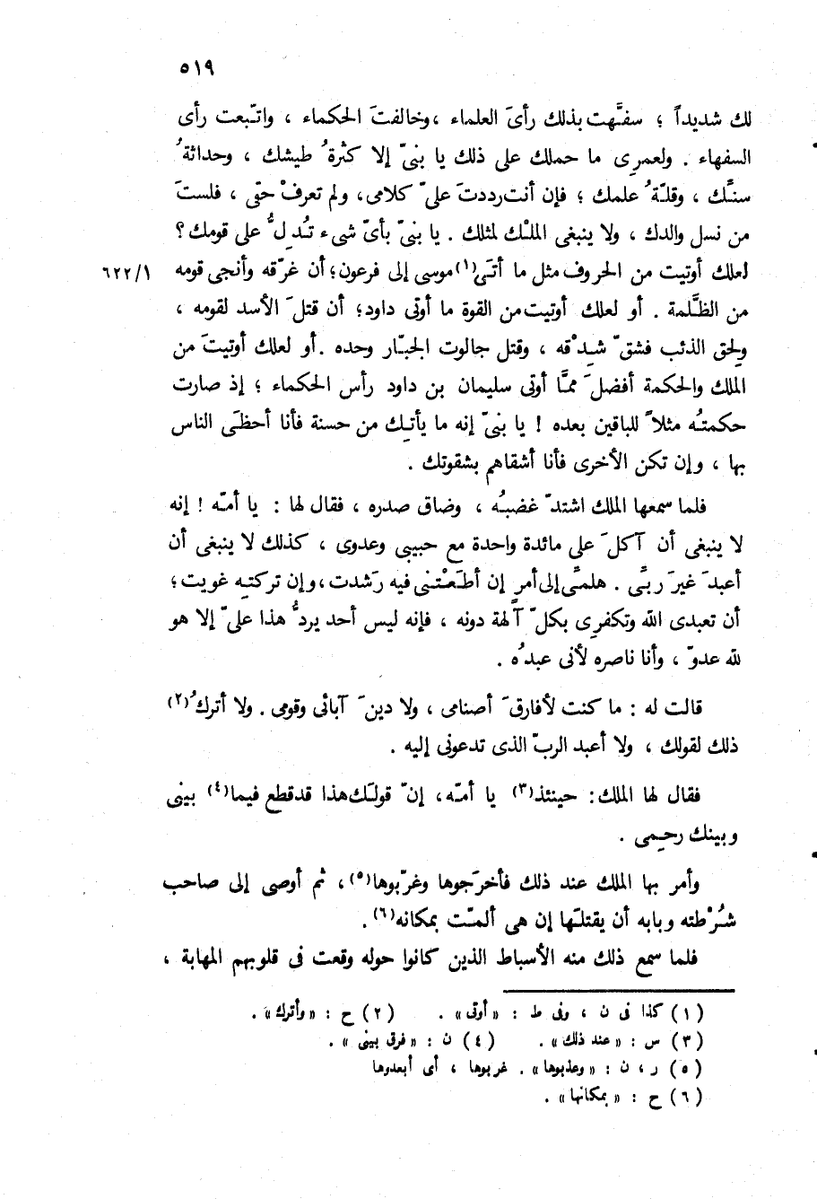 لك شديدا، سفهت بذلك رأي العلماء، وخالفت الحكماء، واتبعت رأي السفهاء ولعمري ما حملك على ذلك يا بني إلا كثرة طيشك، وحداثة سنك، وقلة علمك، فإن أنت رددت علي كلامي، ولم تعرف حقي، فلست من نسل والدك، ولا ينبغي الملك لمثلك يا بني بأي شيء تدل على قومك؟