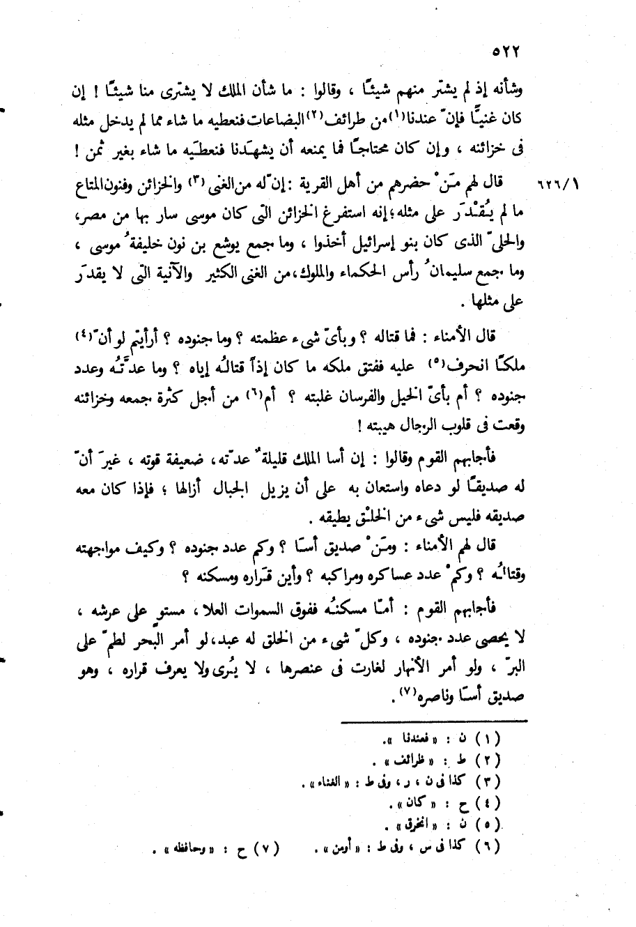 وشأنه إذ لم يشتر منهم شيئا، وقالوا: ما شأن الملك لا يشتري منا شيئا! ان كان غنيا فان عندنا من طرائف البضاعات فنعطيه ما شاء مما لم يدخل مثله في خزائنه، وإن كان محتاجا فما يمنعه أن يشهدنا فنعطيه ما شاء بغير ثمن! قَالَ لهم من حضرهم من أهل القرية: ان له من الغنى والخزائن وفنون المتاع ما لم يقدر على مثله، إنه استفرغ الخزائن التي كان موسى سار بها من مصر، والحلي الذي كان بنو إسرائيل أخذوا، وما جمع يوشع بن نون خليفة موسى، وما جمع سليمان رأس الحكماء والملوك، من الغنى الكثير والآنية التي لا يقدر على مثلها قَالَ الأمناء: فما قتاله؟ وبأي شيء عظمته؟ وما جنوده؟ أرأيتم لو أن ملكا انحرف عليه ففتق ملكه ما كان إذا قتاله إياه؟ وما عدته وعدد جنوده؟ أم بأي الخيل والفرسان غلبته؟ أم من أجل كثرة جمعه وخزائنه وقعت في قلوب الرجال هيبته! فأجابهم القوم وقالوا: إن أسا الملك قليلة عدته، ضعيفة قوته، غير أن له صديقا لو دعاه واستعان به على أن يزيل الجبال أزالها، فإذا كان معه صديقه فليس شيء من الخلق يطيقه.