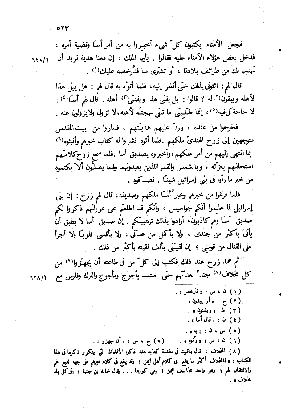 فلما فرغوا من خبرهم وخبر أسا ملكهم وصديقه، قال لهم زرح: إن بني إسرائيل لما علموا أنكم جواسيس، وأنكم قد اطلعتم على عوراتهم ذكروا لكم صديق أسا وهم كاذبون، أرادوا بذلك ترهيبكم إن صديق أسا لا يطيق أن يأتي بأكثر من جندي، ولا بأكمل من عدتي، ولا بأقسى قلوبا ولا أجرأ على القتال من قومي، إن لقيني بألف لقيته بأكثر من ذلك.