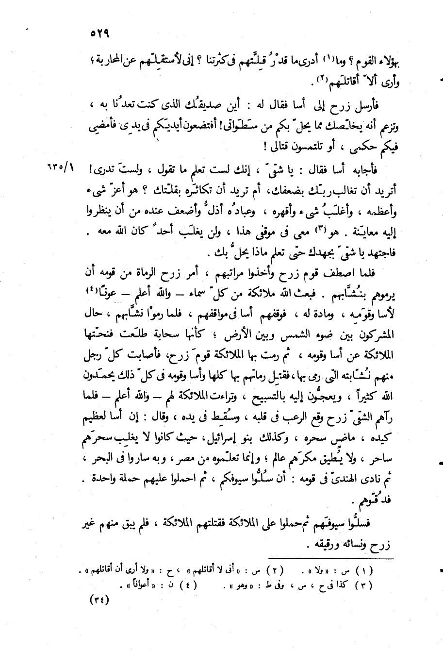 فلما اصطف قوم زرح وأخذوا مراتبهم، امر زرح الرماة من قومه أن يرموهم بنشابهم فبعث الله ملائكة من كل سماء- والله أعلم- عونا لأسا وقومه، ومادة له، فوقفهم أسا في مواقفهم، فلما رموا نشابهم، حال المشركون بين ضوء الشمس وبين الأرض، كأنها سحابة طلعت فنحتها الملائكة عن أسا وقومه، ثم رمت بها الملائكة قوم زرح فأصابت كل رجل منهم نشابته التي رمى بها، فقتل رماتهم بها كلها وأسا وقومه في كل ذلك يحمدون الله كثيرا، ويعجون إليه بالتسبيح، وتراءت الملائكة لهم- والله أعلم- فلما رآهم الشقي زرح وقع الرعب في قلبه، وسقط في يده، وقال: إن أسا لعظيم كيده، ماض سحره، وكذلك بنو إسرائيل، حيث كانوا لا يغلب سحرهم ساحر، ولا يطيق مكرهم عالم، وإنما تعلموه من مصر، وبه ساروا في البحر، ثم نادى الهندي في قومه: أن سلوا سيوفكم، ثم احملوا عليهم حملة واحدة.