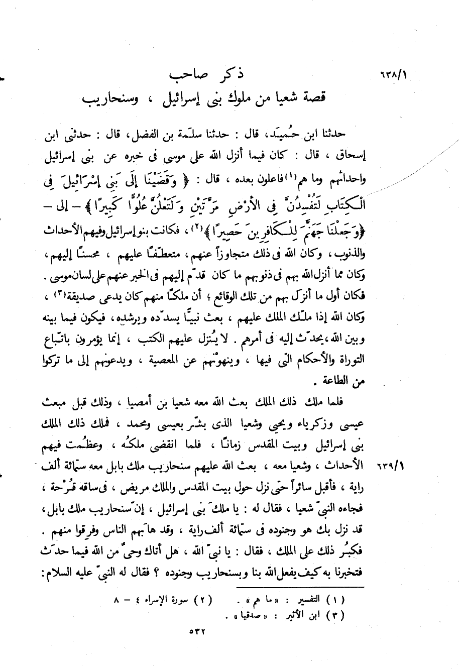 حَدَّثَنَا ابْنُ حُمَيْدٍ، قَالَ: حَدَّثَنَا سَلَمَةُ بْنُ الفضل، قَالَ: حَدَّثَنِي ابن إسحاق، قَالَ: كان فيما أنزل الله على موسى في خبره عن بني إسرائيل وأحداثهم وما هم فاعلون بعده، قَالَ: «وَقَضَيْنا إِلى بَنِي إِسْرائِيلَ فِي الْكِتابِ لَتُفْسِدُنَّ فِي الْأَرْضِ مَرَّتَيْنِ وَلَتَعْلُنَّ عُلُوًّا كَبِيراً» - إلى- «وَجَعَلْنا جَهَنَّمَ لِلْكافِرِينَ حَصِيراً» ، فكانت بنو إسرائيل وفيهم الأحداث والذنوب، وكان الله في ذلك متجاوزا عنهم، متعطفا عليهم، محسنا إليهم، وكان مما أنزل الله بهم في ذنوبهم ما كان قدم إليهم في الخبر عنهم على لسان موسى.