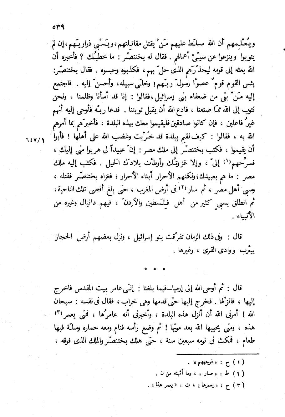بئس القوم قوم عصوا رسول ربهم! وخلى سبيله، وأحسن إليه فاجتمع إليه من بقي من ضعفاء بني إسرائيل، فقالوا: إنا قد أسأنا وظلمنا، ونحن نتوب إلى الله مما صنعنا، فادع الله أن يقبل توبتنا فدعا ربه فأوحى إليه أنهم غير فاعلين، فإن كانوا صادقين فليقيموا معك بهذه البلدة، فأخبرهم بما أمرهم الله به، فقالوا: كيف نقيم ببلدة قد خربت وغضب الله على أهلها! فأبوا أن يقيموا، فكتب بختنصر إلى ملك مصر: إن عبيدا لي هربوا مني إليك، فسرحهم إلي، وإلا غزوتك وأوطأت بلادك الخيل فكتب إليه ملك مصر: ما هم بعبيدك، ولكنهم الأحرار أبناء الأحرار، فغزاه بختنصر فقتله، وسبى أهل مصر، ثم سار في أرض المغرب، حتى بلغ أقصى تلك الناحية، ثم انطلق بسبي كثير من أهل فلسطين والأردن، فيهم دانيال وغيره من الأنبياء.