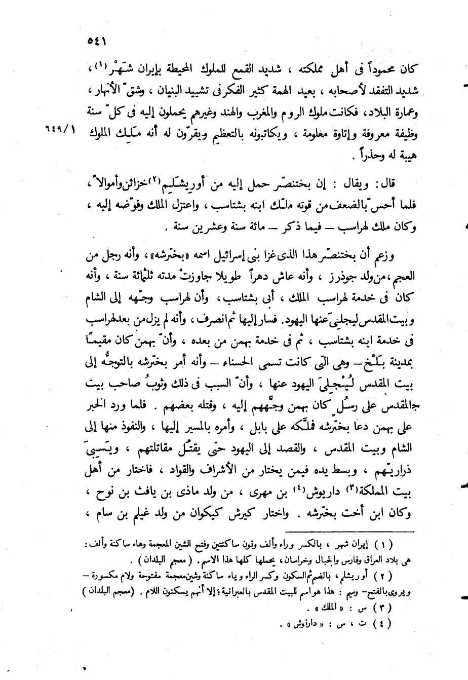 وزعم أن بختنصر هذا الذي غزا بني إسرائيل اسمه بخترشه، وأنه رجل من العجم، من ولد جوذرز، وأنه عاش دهرا طويلا جاوزت مدته ثلاثمائة سنة، وأنه كان في خدمة لهراسب الملك، أبي بشتاسب، وأن لهراسب وجهه إلى الشام وبيت المقدس ليجلي عنها اليهود فسار إليها ثم انصرف، وأنه لم يزل من بعد لهراسب في خدمة ابنه بشتاسب، ثم في خدمة بهمن من بعده، وأن بهمن كان مقيما بمدينة بلخ- وهي التي كانت تسمى الحسناء- وأنه أمر بخترشه بالتوجه إلى بيت المقدس ليجلي اليهود عنها، وأن السبب في ذلك وثوب صاحب بيت المقدس على رسل كان بهمن وجههم إليه، وقتله بعضهم فلما ورد الخبر على بهمن دعا بخترشه فملكه على بابل، وأمره بالمسير إليها، والنفوذ منها إلى الشام وبيت المقدس، والقصد إلى اليهود حتى يقتل مقاتلتهم، ويسبي ذراريهم، وبسط يده فيمن يختار من الأشراف والقواد، فاختار من أهل بيت المملكة داريوش بن مهرى، من ولد ماذي بن يافث بن نوح، وكان ابن أخت بخترشه واختار كيرش كيكوان من ولد غيلم بن سام،