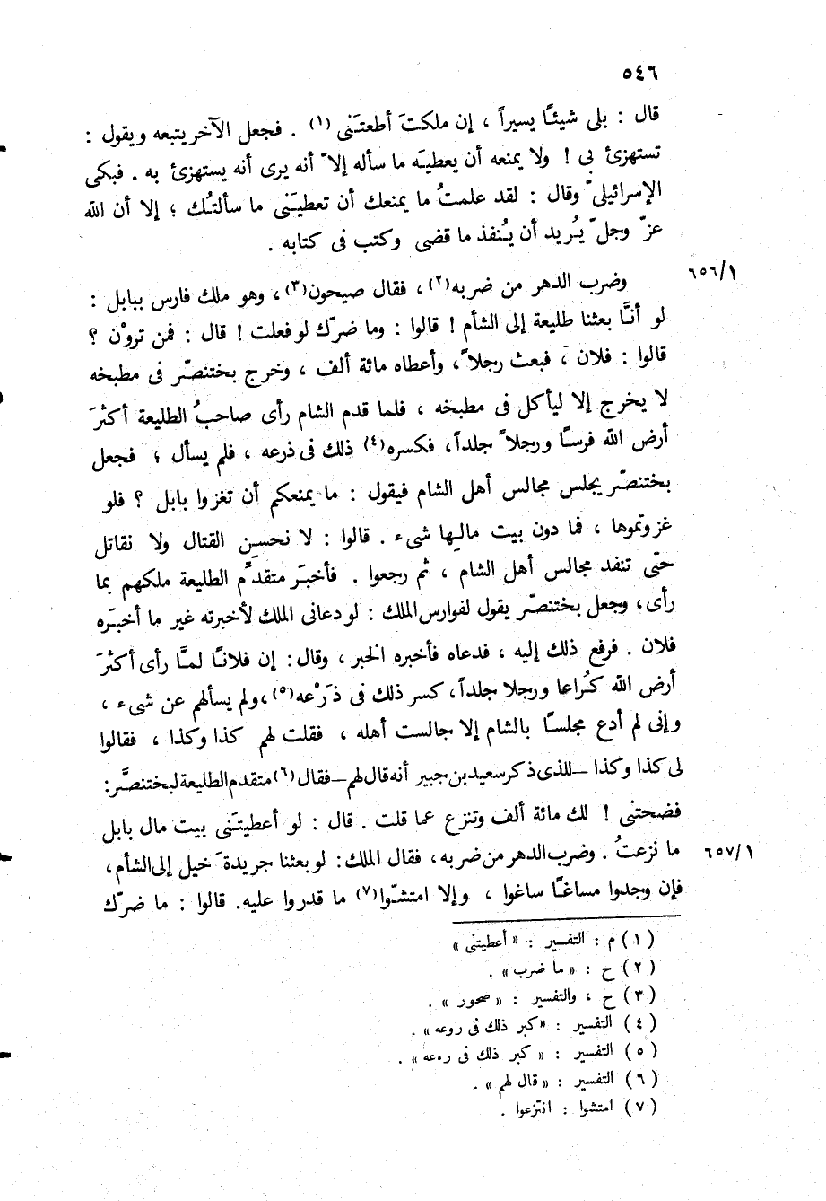 قَالُوا: فلان، فبعث رجلا، واعطاه مائه والف، وخرج بختنصر في مطبخه لا يخرج إلا ليأكل في مطبخه، فلما قدم الشام رأى صاحب الطليعة أكثر أرض الله فرسا ورجلا جلدا، فكسره ذلك في ذرعه، فلم يسأل، فجعل بختنصر يجلس مجالس أهل الشام فيقول: ما يمنعكم أن تغزوا بابل؟ فلو غزوتموها، فما دون بيت مالها شيء قَالُوا: لا نحسن القتال ولا نقاتل حتى تنفذ مجالس أهل الشام، ثم رجعوا فأخبر متقدم الطليعة ملكهم بما رأى، وجعل بختنصر يقول لفوارس الملك: لو دعاني الملك لأخبرته غير ما أخبره فلان فرفع ذلك إليه، فدعاه فأخبره الخبر، وقال: إن فلانا لما رأى أكثر أرض الله كراعا ورجلا جلدا، كسر ذلك في ذرعه، ولم يسألهم عن شيء، وإني لم أدع مجلسا بالشام إلا جالست أهله، فقلت لهم كذا وكذا، فقالوا لي كذا وكذا- للذي ذكر سعيد بن جبير أنه قَالَ لهم- فقال متقدم الطليعة لبختنصر:
