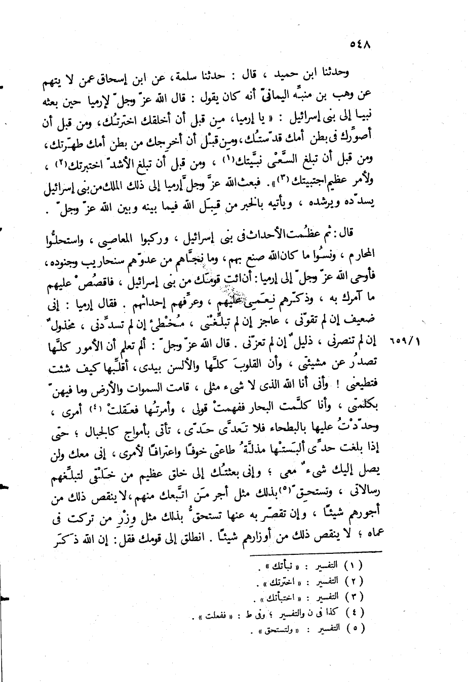 وحدثنا ابن حميد، قال: حدثنا سلمة، عن ابن إسحاق عمن لا يتهم عن وهب بن منبه اليماني أنه كان يقول: قَالَ الله عز وجل لإرميا حين بعثه نبيا إلى بني إسرائيل: يا إرميا، من قبل أن أخلقك اخترتك، ومن قبل أن أصورك في بطن أمك قدستك، ومن قبل أن أخرجك من بطن أمك طهرتك، ومن قبل أن تبلغ السعي نبيتك، ومن قبل أن تبلغ الأشد اختبرتك، ولأمر عظيم اجتبيتك فبعث الله عز وجل إرميا إلى ذلك الملك من بني إسرائيل يسدده ويرشده، ويأتيه بالخبر من قبل الله فيما بينه وبين الله عز وجل قال: ثم عظمت الأحداث في بني إسرائيل، وركبوا المعاصي، واستحلوا المحارم، ونسوا ما كان الله صنع بهم، وما نجاهم من عدوهم سنحاريب وجنوده، فأوحى الله عز وجل إلى إرميا: أن ائت قومك من بني إسرائيل، فاقصص عليهم ما آمرك به، وذكرهم نعمي عليهم، وعرفهم أحداثهم فقال إرميا: إني ضعيف إن لم تقوني، عاجز إن لم تبلغني، مخطئ إن لم تسددني، مخذول إن لم تنصرني، ذليل إن لم تعزني قَالَ الله عز وجل: ألم تعلم أن الأمور كلها تصدر عن مشيئتي، وأن القلوب كلها والألسن بيدي، أقلبها كيف شئت فتطيعني! وأني أنا الله الذي لا شيء مثلي، قامت السموات والأرض وما فيهن بكلمتي، وأنا كلمت البحار ففهمت قولي، وأمرتها فعقلت أمري، وحددت عليها بالبطحاء فلا تعدى حدي، تأتي بأمواج كالجبال، حتى إذا بلغت حدي ألبستها مذلة طاعتي خوفا واعترافا لأمري، إني معك ولن يصل إليك شيء معي، وإني بعثتك إلى خلق عظيم من خلقي لتبلغهم رسالاتي، ونستحق بذلك مثل أجر من اتبعك منهم، لا ينقص ذلك من أجورهم شيئا، وإن تقصر به عنها تستحق بذلك مثل وزر من تركت في عماه، لا ينقص ذلك من أوزارهم شيئا انطلق إلى قومك فقل: إن الله ذكر