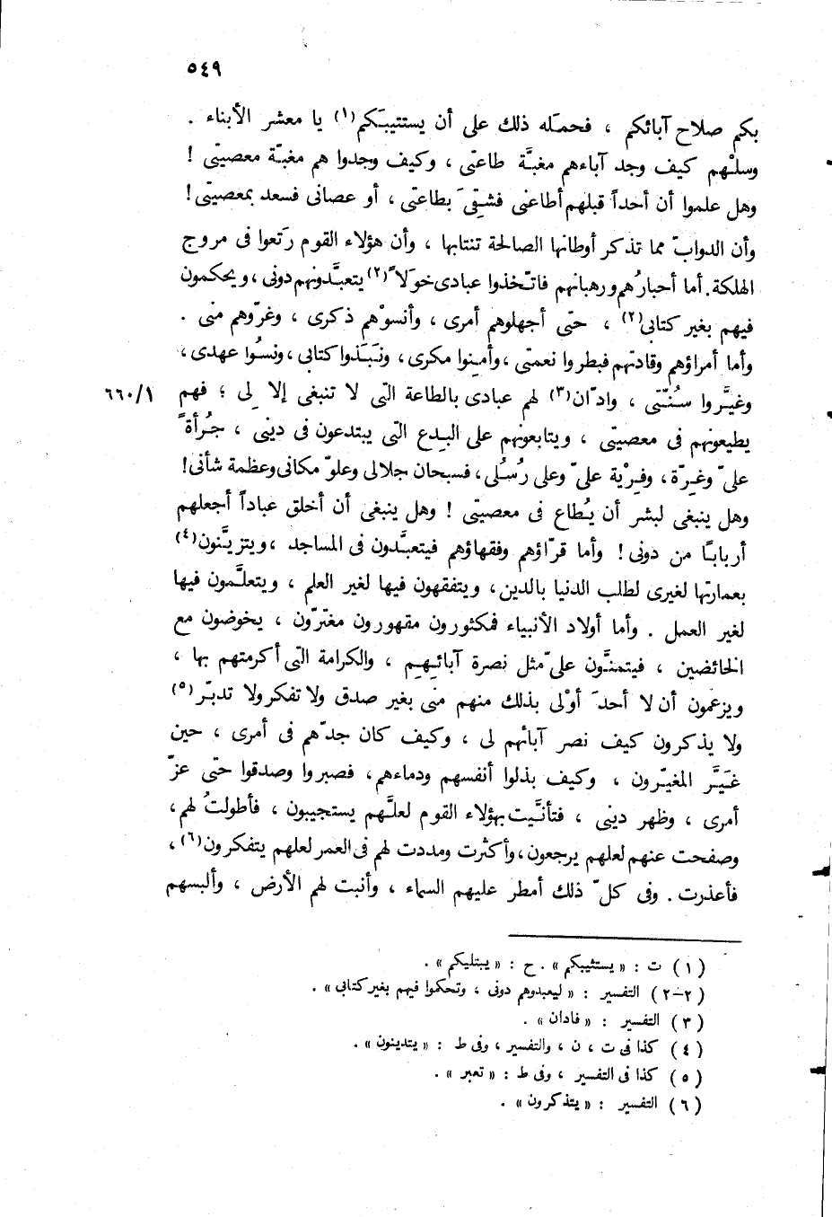 وأما أمراؤهم وقادتهم فبطروا نعمتي، وأمنوا مكري، ونبذوا كتابي، ونسوا عهدي، وغيروا سنتي، وادان لهم عبادي بالطاعة التي لا تنبغي إلا لي، فهم يطيعونهم في معصيتي، ويتابعونهم على البدع التي يبتدعون في ديني، جرأة علي وغرة، وفرية علي وعلى رسلي فسبحان جلالي وعلو مكاني وعظمة شأني! وهل ينبغي لبشر أن يطاع في معصيتي! وهل ينبغي أن أخلق عبادا أجعلهم أربابا من دوني! وأما قراؤهم وفقهاؤهم فيتعبدون في المساجد، ويتزينون بعمارتها لغيري لطلب الدنيا بالدين، ويتفقهون فيها لغير العلم، ويتعلمون فيها لغير العمل وأما أولاد الأنبياء فمكثورون مقهورون مغترون، يخوضون مع الخائضين، فيتمنون علي مثل نصرة آبائهم، والكرامة التي أكرمتهم بها، ويزعمون أن لا أحد أولى بذلك منهم مني بغير صدق ولا تفكر ولا تدبر ولا يذكرون كيف نصر آبائهم لي، وكيف كان جدهم في أمري، حين غير المغيرون، وكيف بذلوا أنفسهم ودماءهم، فصبروا وصدقوا حتى عز أمري، وظهر ديني، فتأنيت بهؤلاء القوم لعلهم يستجيبون، فأطولت لهم، وصفحت عنهم لعلهم يرجعون، واكثرت ومددت لهم في العمر لعلهم يتفكرون، فأعذرت وفي كل ذلك أمطر عليهم السماء، وأنبت لهم الأرض، وألبسهم