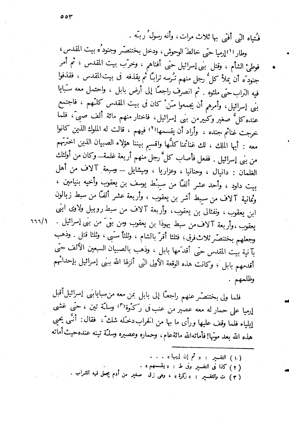 وجعلهم بختنصر ثلاث فرق، فثلثا أقر بالشام، وثلثا سبى، وثلثا قتل وذهب بآنية بيت المقدس حتى أقدمها بابل، وذهب بالصبيان السبعين الألف حتى أقدمهم بابل، وكانت هذه الوقعه الاولى التي أنزلها الله ببني إسرائيل بإحداثهم وظلمهم.