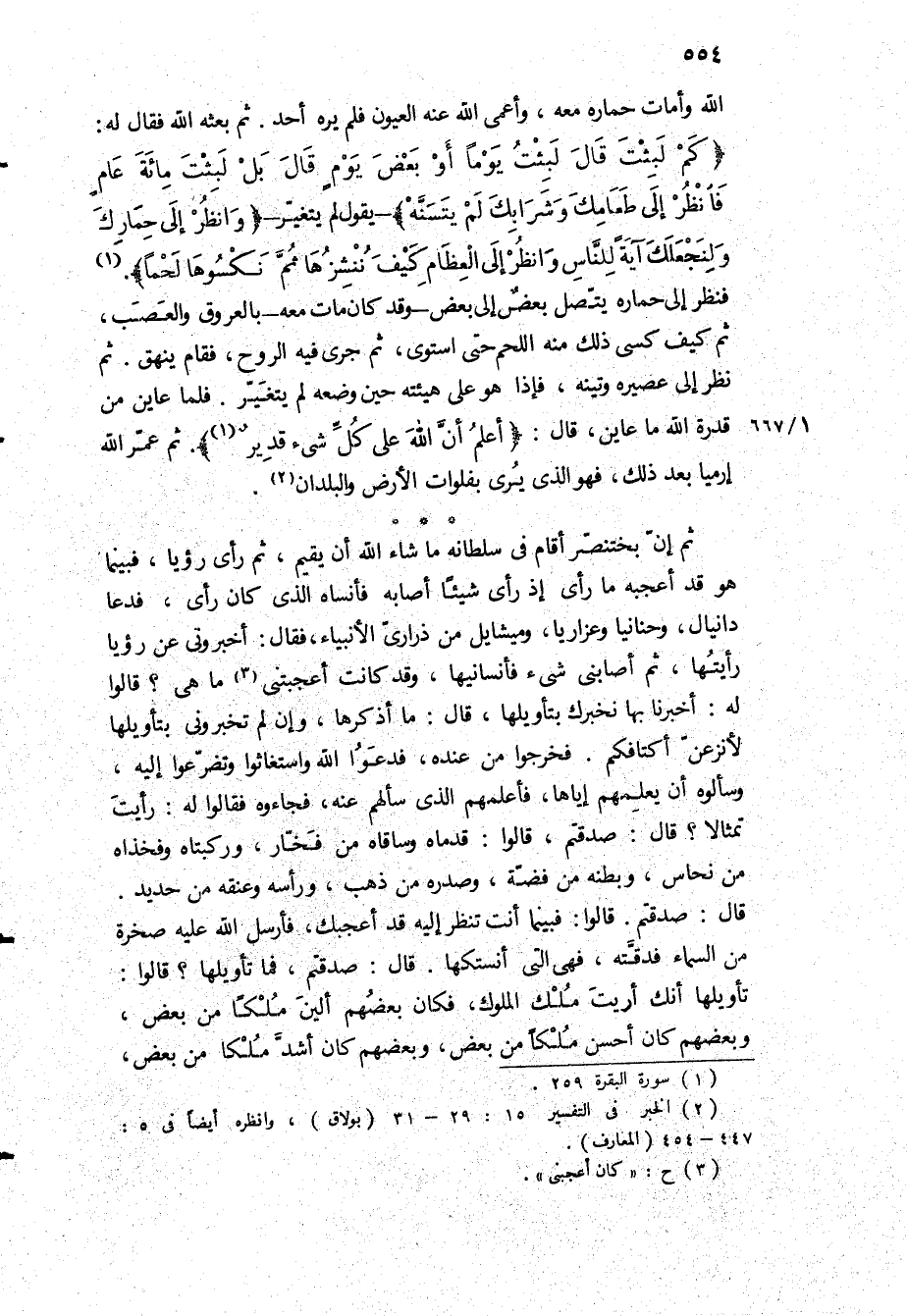 «كَمْ لَبِثْتَ قالَ لَبِثْتُ يَوْماً أَوْ بَعْضَ يَوْمٍ قالَ بَلْ لَبِثْتَ مِائَةَ عامٍ فَانْظُرْ إِلى طَعامِكَ وَشَرابِكَ لَمْ يَتَسَنَّهْ» - يقول لم يتغير- «وَانْظُرْ إِلى حِمارِكَ وَلِنَجْعَلَكَ آيَةً لِلنَّاسِ وَانْظُرْ إِلَى الْعِظامِ كَيْفَ نُنْشِزُها ثُمَّ نَكْسُوها لَحْماً» .