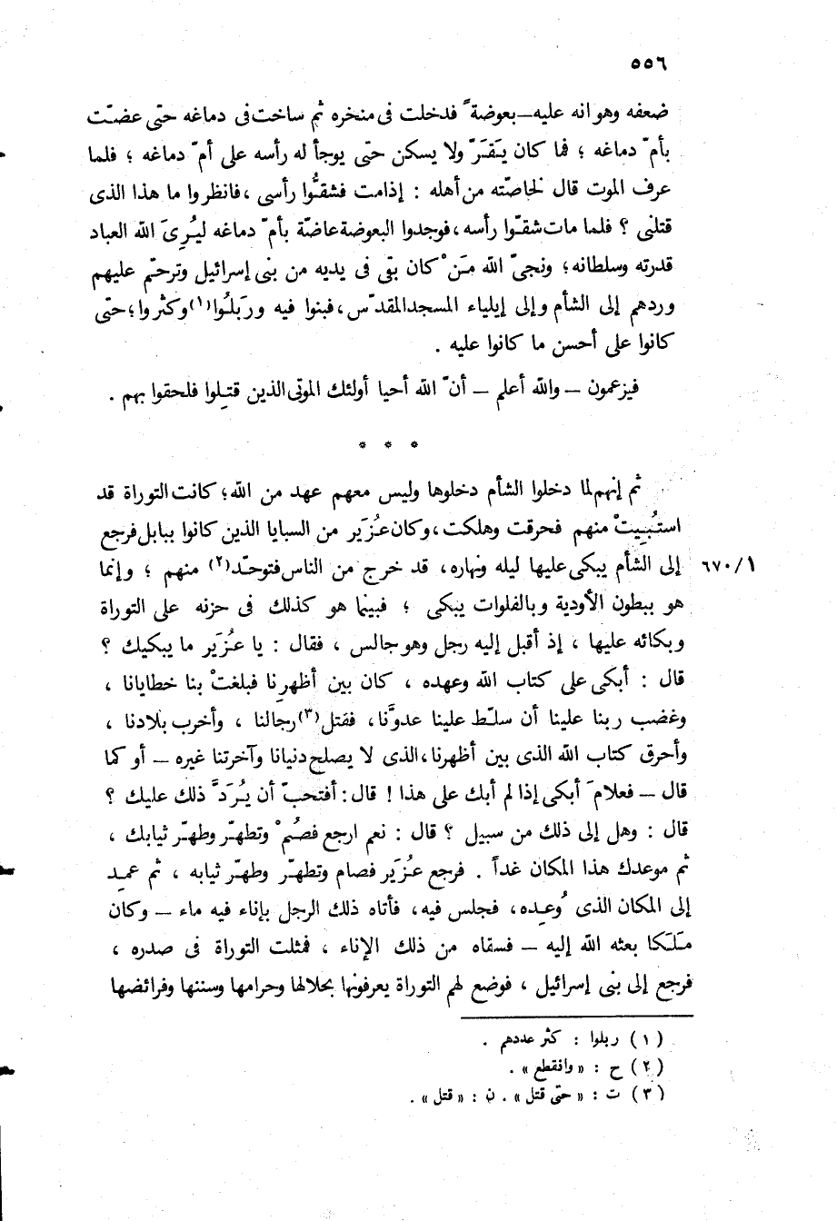 ثم إنهم لما دخلوا الشام دخلوها وليس معهم عهد من الله، كانت التوراة قد استبيت منهم فحرقت وهلكت وكان عزيز من السبايا الذين كانوا ببابل فرجع إلى الشام يبكي عليها ليله ونهاره، قد خرج من الناس فتوحد منهم، وإنما هو ببطون الأودية وبالفلوات يبكي، فبينما هو كذلك في حزنه على التوراة وبكائه عليها، إذ أقبل إليه رجل وهو جالس، فقال: يا عزير ما يبكيك؟