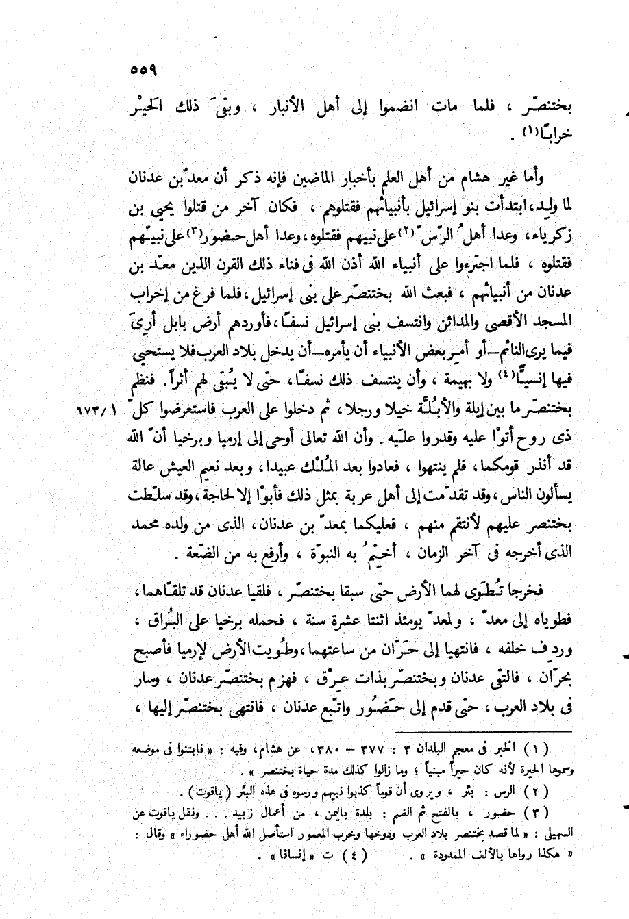 وأما غير هشام من أهل العلم بأخبار الماضين فإنه ذكر أن معد بن عدنان لما ولد، ابتدأت بنو إسرائيل بأنبيائهم فقتلوهم، فكان آخر من قتلوا يحيى بن زكرياء، وعدا أهل الرس على نبيهم فقتلوه، وعدا أهل حضور على نبيهم فقتلوه، فلما اجترءوا على أنبياء الله أذن الله في فناء ذلك القرن الذين معد بن عدنان من أنبيائهم، فبعث الله بختنصر على بني إسرائيل، فلما فرغ من إخراب المسجد الأقصى والمدائن وانتسف بني إسرائيل نسفا، فأوردهم أرض بابل أري فيما يرى النائم- أو أمر بعض الأنبياء أن يأمره- أن يدخل بلاد العرب فلا يستجبى فيها إنسيا ولا بهيمة، وأن ينتسف ذلك نسفا، حتى لا يبقي لهم أثرا فنظم بختنصر ما بين إيلة والأبلة خيلا ورجلا، ثم دخلوا على العرب فاستعرضوا كل ذي روح أتوا عليه وقدروا عليه وأن الله تعالى أوحى إلى إرميا وبرخيا أن الله قد أنذر قومكما، فلم ينتهوا، فعادوا بعد الملك عبيدا، وبعد نعيم العيش عالة يسألون الناس، وقد تقدمت إلى أهل عربة بمثل ذلك فأبوا إلا لحاجة، وقد سلطت بختنصر عليهم لأنتقم منهم فعليكما بمعد بن عدنان، الذى من ولده محمد الذي أخرجه في آخر الزمان، أختم به النبوة، وأرفع به من الضعة.