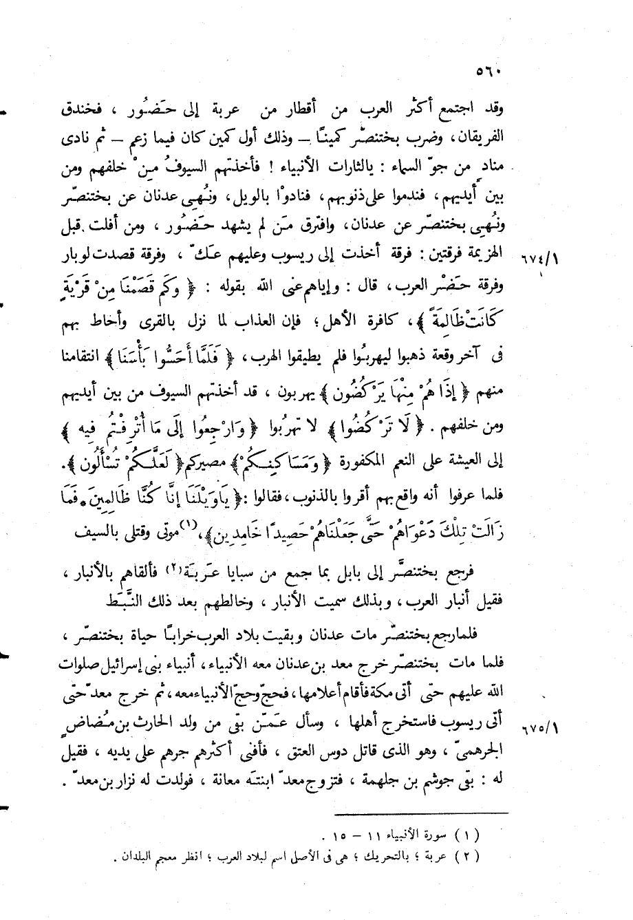وقد اجتمع أكثر العرب من أقطار من عربة إلى حضور، فخندق الفريقان، وضرب بختنصر كمينا- وذلك أول كمين كان فيما زعم- ثم نادى مناد من جو السماء: يا لثارات الأنبياء! فأخذتهم السيوف من خلفهم ومن بين أيديهم، فندموا على ذنوبهم، فنادوا بالويل، ونهي عدنان عن بختنصر ونهي بختنصر عن عدنان، وافترق من لم يشهد حضور، ومن أفلت قبل الهزيمة فرقتين: فرقة أخذت إلى ريسوب وعليهم عك، وفرقة قصدت لوبار وفرقة حضر العرب، قَالَ: وإياهم عنى الله بقوله: «وَكَمْ قَصَمْنا مِنْ قَرْيَةٍ كانَتْ ظالِمَةً» ، كافرة الأهل، فإن العذاب لما نزل بالقرى وأحاط بهم في آخر وقعة ذهبوا ليهربوا فلم يطيقوا الهرب، «فَلَمَّا أَحَسُّوا بَأْسَنا» انتقامنا منهم «إِذا هُمْ مِنْها يَرْكُضُونَ» يهربون، قد أخذتهم السيوف من بين أيديهم ومن خلفهم «لا تَرْكُضُوا» لا تهربوا «وَارْجِعُوا إِلى مَا أُتْرِفْتُمْ فِيهِ» الى العيشه على النعم المكفورة «وَمَساكِنِكُمْ» مصيركم «لَعَلَّكُمْ تُسْئَلُونَ» .