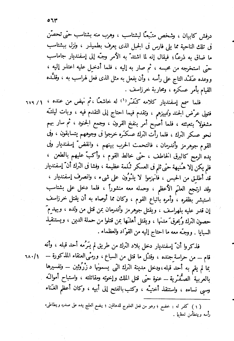 فذكروا أن إسفنديار دخل بلاد الترك من طريق لم يرمه أحد قبله، وأنه قام- من حراسة جنده، وقتل ما قتل من السباع، ورمي العنقاء المذكورة- بما لم يقم به أحد قبله، ودخل مدينة الترك التي يسمونها دزروئين- وتفسيرها بالعربية الصفرية- عنوة حتى قتل الملك وإخوته ومقاتلته، واستباح أمواله وسبى نساءه، واستنقذ أختيه، وكتب بالفتح إلى أبيه، وكان أعظم الغناء