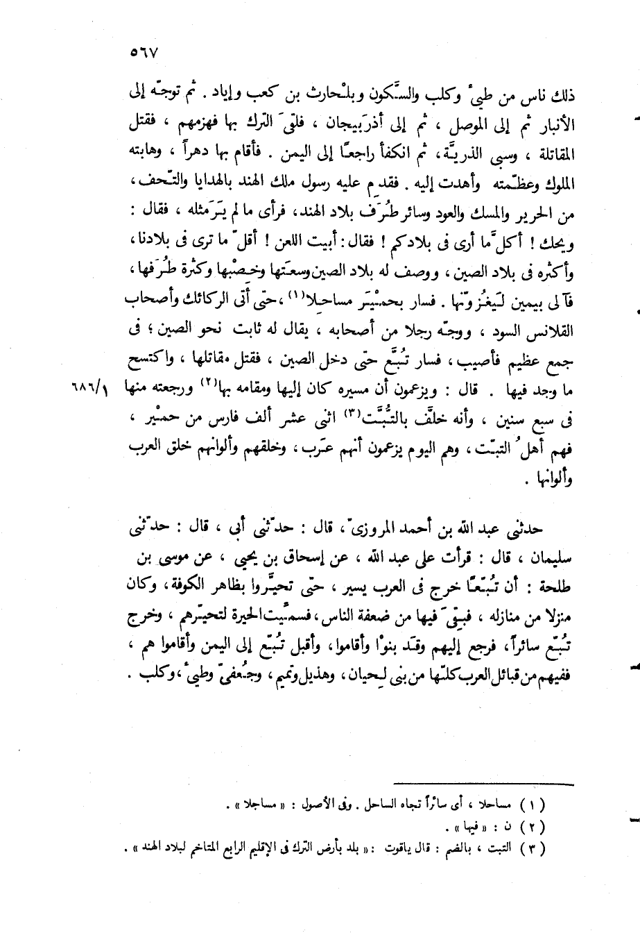 حَدَّثَنِي عبد الله بن أحمد المروزي، قَالَ: حَدَّثَنِي أَبِي، قَالَ: حَدَّثَنِي سُلَيْمَانُ، قَالَ: قَرَأْتُ على عَبْدُ اللَّهِ، عَنْ إِسْحَاقَ بْنِ يَحْيَى، عَنْ موسى بن طلحة: أن تبعا خرج في العرب يسير، حتى تحيروا بظاهر الكوفة، وكان منزلا من منازله، فبقي فيها من ضعفة الناس، فسميت الحيرة لتحيرهم، وخرج تبع سائرا، فرجع إليهم وقد بنوا وأقاموا، وأقبل تبع إلى اليمن وأقاموا هم، ففيهم من قبائل العرب كلها من بنى لحيان، وهذيل وتميم، وجعفي وطيّئ، وكلب