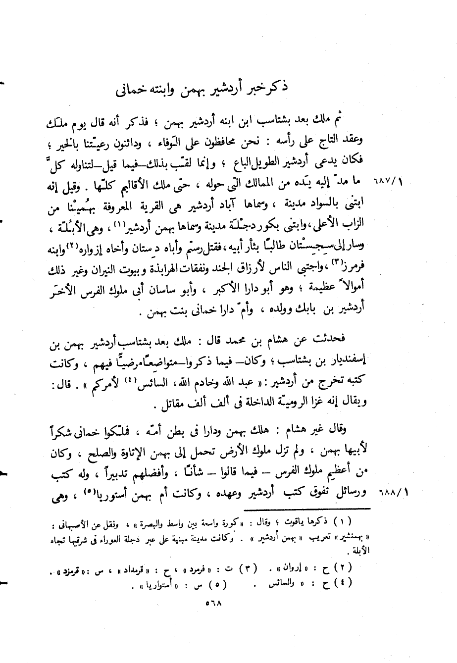 وقال غير هشام: هلك بهمن ودارا في بطن أمه، فملكوا خماني شكرا لأبيها بهمن، ولم تزل ملوك الأرض تحمل إلى بهمن الإتاوة والصلح، وكان من أعظم ملوك الفرس- فيما قَالُوا- شأنا، وأفضلهم تدبيرا، وله كتب ورسائل تفوق كتب أردشير وعهده، وكانت أم بهمن أستوريا، وهي