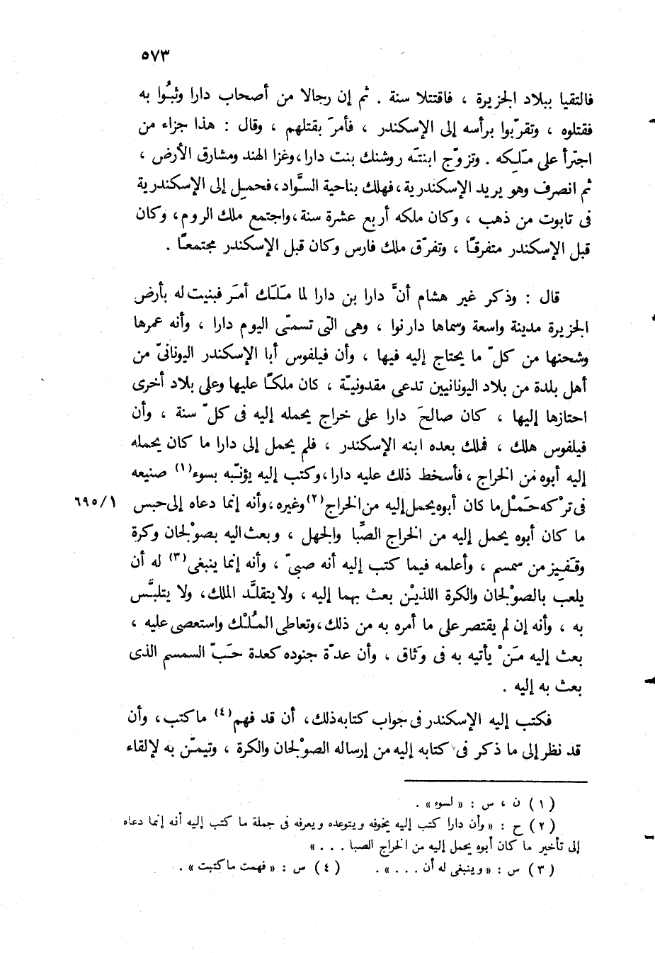 قَالَ: وذكر غير هشام أن دارا بن دارا لما ملك أمر فبنيت له بأرض الجزيرة مدينة واسعة وسماها دارنوا، وهي التي تسمى اليوم دارا، وانه عمرها وشحنها من كل ما يحتاج إليه فيها، وأن فيلفوس أبا الإسكندر اليوناني من أهل بلدة من بلاد اليونانيين تدعى مقدونية، كان ملكا عليها وعلى بلاد أخرى احتازها إليها، كان صالح دارا على خراج يحمله إليه في كل سنة، وأن فيلفوس هلك، فملك بعده ابنه الإسكندر، فلم يحمل إلى دارا ما كان يحمله إليه أبوه من الخراج، فأسخط ذلك عليه دارا، وكتب إليه يؤنبه بسوء صنيعه في تركه حمل ما كان أبوه يحمل إليه من الخراج وغيره، وأنه إنما دعاه إلى حبس ما كان أبوه يحمل إليه من الخراج الصبا والجهل، وبعث إليه بصولجان وكرة وقفيز من سمسم، وأعلمه فيما كتب إليه أنه صبي، وأنه إنما ينبغي له أن يلعب بالصولجان والكرة اللذين بعث بهما إليه، ولا يتقلد الملك، ولا يتلبس به، وأنه إن لم يقتصر على ما أمره به من ذلك، وتعاطى الملك واستعصى عليه، بعث إليه من يأتيه به في وثاق، وأن عدة جنوده كعدة حب السمسم الذي بعث به إليه.