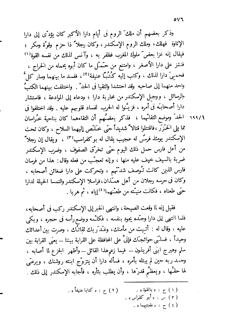 وذكر بعضهم أن ملك الروم في أيام دارا الأكبر كان يؤدي إلى دارا الإتاوة فهلك، وملك الروم الإسكندر، وكان رجلا ذا حزم وقوة ومكر، فيقال إنه غزا بعض ملوك المغرب فظفر به، وآنس لذلك من نفسه القوة فنشز على دارا الأصغر، وامتنع من حمل ما كان أبوه يحمله من الخراج، فحمي دارا لذلك، وكتب إليه كتبا عنيفة، ففسد ما بينهما وسار كل واحد منهما إلى صاحبه وقد احتشدا والتقيا في الحد واختلفت بينهما الكتب والرسائل، ووجل الإسكندر من محاربة دارا، ودعاه إلى الموادعة، فاستشار دارا أصحابه في أمره، فزينوا له الحرب لفساد قلوبهم عليه وقد اختلفوا في الحد وموضع التقائهما، فذكر بعضهم ان التقائهما كان بناحية خراسان مما يلي الخزر، فاقتتلوا قتالا شديدا حتى خلص إليهما السلاح، وكان تحت الإسكندر يومئذ فرس له عجيب يقال له بوكفراسب، ويقال إن رجلا من أهل فارس حمل ذلك اليوم حتى تخرق الصفوف، وضرب الإسكندر ضربة بالسيف خيف عليه منها، وإنه تعجب من فعله وقال: هذا من فرسان فارس الذين كانت توصف شدتهم، وتحركت على دارا ضغائن أصحابه، وكان في حرسه رجلان من أهل همذان، فراسلا الإسكندر والتمسا الحيلة لدارا حتى طعناه، فكانت منيته من طعنهما إياه، ثم هربا.