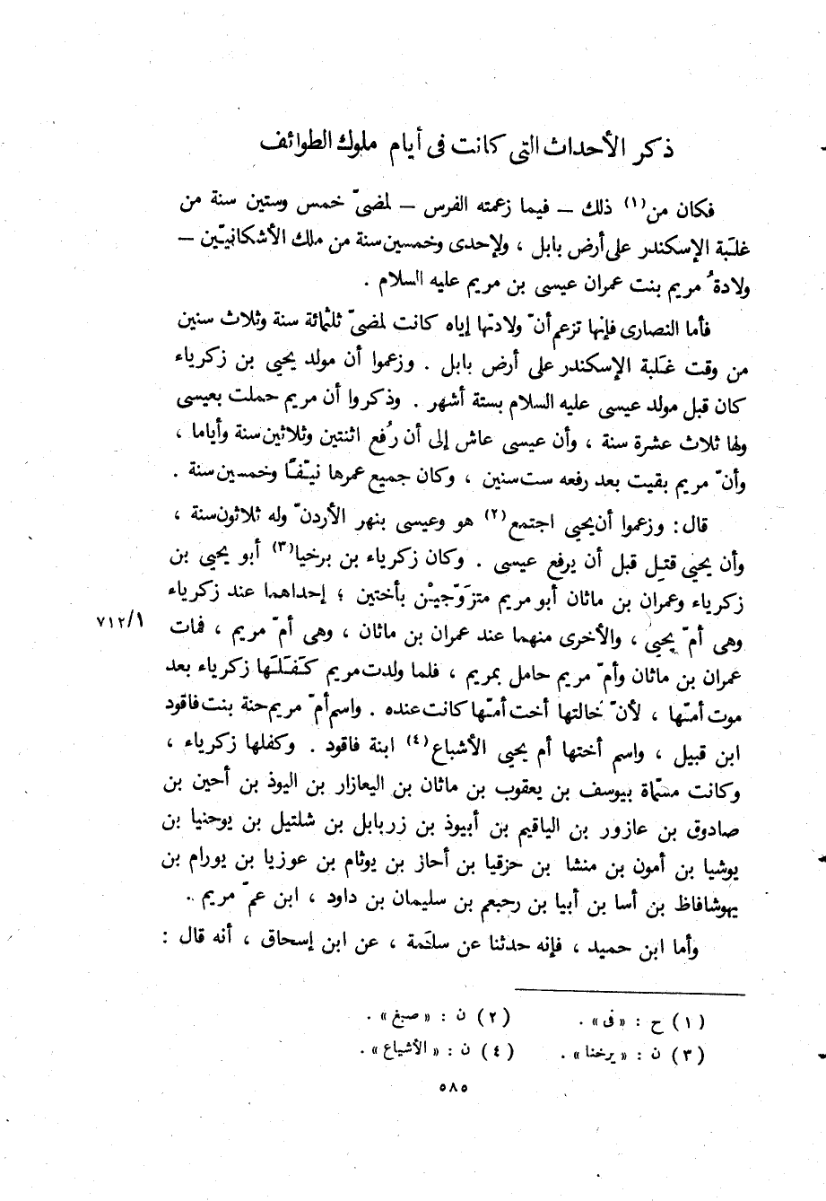 فكان من ذلك- فيما زعمته الفرس- لمضي خمس وستين سنة من غلبة الإسكندر على أرض بابل، ولإحدى وخمسين سنة من ملك الأشكانيين- ولادة مريم بنت عمران عيسى بن مريم ع.