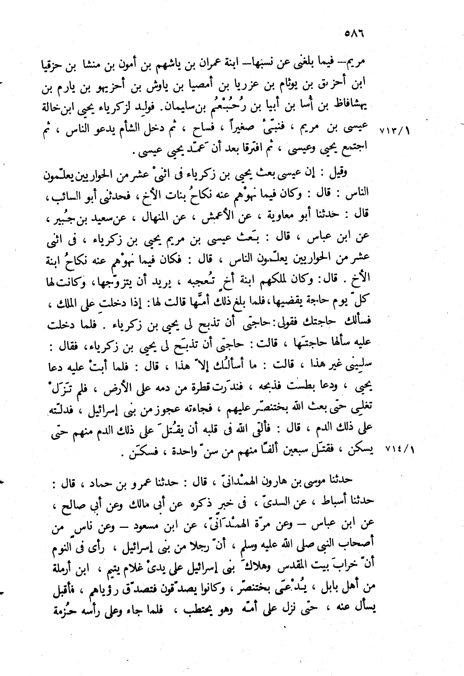 مريم- فيما بلغني عن نسبها- ابنة عمران بن ياشهم بن أمون بن منشا بن حزقيا ابن احزيق بن يوثام بن عزريا بن أمصيا بن ياوش بن أحزيهو بن يارم بن يهشافاط بن أسا بن أبيا بن رحبعم بن سليمان فولد لزكرياء يحيى ابن خالة عيسى بن مريم، فنبئ صغيرا، فساح، ثم دخل الشام يدعو الناس، ثم اجتمع يحيى وعيسى، ثم افترقا بعد أن عمد يحيى عيسى.