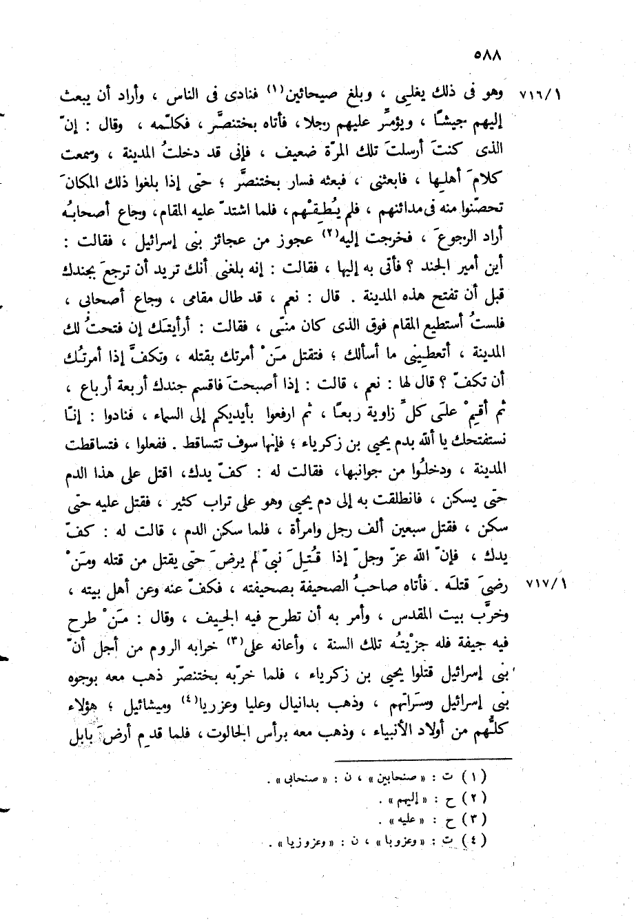 أَيْنَ أَمِيرُ الْجُنْدِ؟ فَأُتِيَ بِهِ إِلَيْهَا، فَقَالَتْ: إِنَّهُ بَلَغَنِي أَنَّكَ تُرِيدُ أَنْ تَرْجِعَ بِجُنْدِكَ قَبْلَ أَنْ تَفْتَحَ هَذِهِ الْمَدِينَةَ قَالَ: نَعَمْ، قَدْ طَالَ مُقَامِي، وَجَاعَ أَصْحَابِي، فَلَسْتُ أَسْتَطِيعُ الْمُقَامَ فَوْقَ الَّذِي كَانَ مِنِّي، فَقَالَتْ: أَرَأَيْتُكَ إِنْ فُتِحَتْ لَكَ الْمَدِينَةُ، أَتُعْطِينِي مَا أَسْأَلُكَ، فَتَقْتُلُ مَنْ أَمَرْتُكَ بِقَتْلِهِ، وَتَكُفُّ إِذَا أَمَرْتُكَ أَنْ تَكُفَّ؟ قَالَ لَهَا: نَعَمْ، قَالَتْ: إِذَا أَصْبَحْتَ فَاقْسِمْ جُنْدَكَ أَرْبَعَةَ أَرْبَاعٍ، ثُمَّ أَقِمْ عَلَى كُلِّ زَاوِيَةٍ رُبْعًا، ثُمَّ ارْفَعُوا بِأَيْدِيكُمْ إِلَى السَّمَاءِ، فَنَادَوْا: إِنَّا نَسْتَفْتِحُكَ يَا اللَّهِ بِدَمِ يَحْيَى بْنِ زَكَرِيَّاءَ، فَإِنَّها سَوْفَ تَتَسَاقَطُ فَفَعَلُوا، فَتَسَاقَطَتِ الْمَدِينَةُ، وَدَخَلُوا مِنْ جَوَانِبِهَا، فَقَالَتْ لَهُ: كُفَّ يَدَكَ، اقْتُلْ عَلَى هَذَا الدَّمِ حَتَّى يَسْكُنَ، فَانْطَلَقَتْ بِهِ إِلَى دَمِ يَحْيَى وَهُوَ عَلَى تُرَابٍ كَثِيرٍ، فَقَتَلَ عَلَيْهِ حَتَّى سَكَنَ، فَقَتَلَ سَبْعِينَ أَلْفَ رَجُلٍ وَامْرَأَةٍ، فَلَمَّا سَكَنَ الدَّمُ، قَالَتْ لَهُ: كُفَّ يَدَكَ، فَإِنَّ اللَّهَ عَزَّ وَجَلَّ إِذَا قُتِلَ نَبِيٌّ لَمْ يَرْضَ حَتَّى يُقْتَلَ مَنْ قَتَلَهُ وَمَنْ رَضِيَ قَتْلَهُ فَأَتَاهُ صَاحِبُ الصَّحِيفَةِ بِصَحِيفَتِهِ، فَكَفَّ عَنْهُ وَعَنْ أَهْلِ بَيْتِهِ، وَخَرَّبَ بَيْتَ الْمَقْدِسِ، وَأَمَرَ بِهِ أَنْ تُطْرَحَ فِيهِ الْجِيَفُ، وَقَالَ: مَنْ طَرَحَ فِيهِ جِيفَةً فَلَهُ جِزْيَتُهُ تِلْكَ السَّنَةَ، وَأَعَانَهُ عَلَى خَرَابِهِ الرُّومُ مِنْ أَجْلِ أَنَّ بَنِي إِسْرَائِيلَ قَتَلُوا يَحْيَى بْنَ زَكَرِيَّاءَ، فَلَمَّا خَرَّبَهُ بُخْتَنَصَّرُ ذَهَبَ مَعَهُ بِوُجُوهِ بَنِي إِسْرَائِيلَ وَسَرَاتِهِمْ، وَذَهَبَ بِدَانْيَالَ وَعليَا وعزريَا وَمِيشَائِيلَ، هَؤُلَاءِ كُلُّهُمْ مِنْ أَوْلَادِ الْأَنْبِيَاءِ، وَذَهَبَ مَعَهُ بِرَأْسِ الْجَالُوتِ، فَلَمَّا قَدِمَ أَرْضَ بَابِلَ