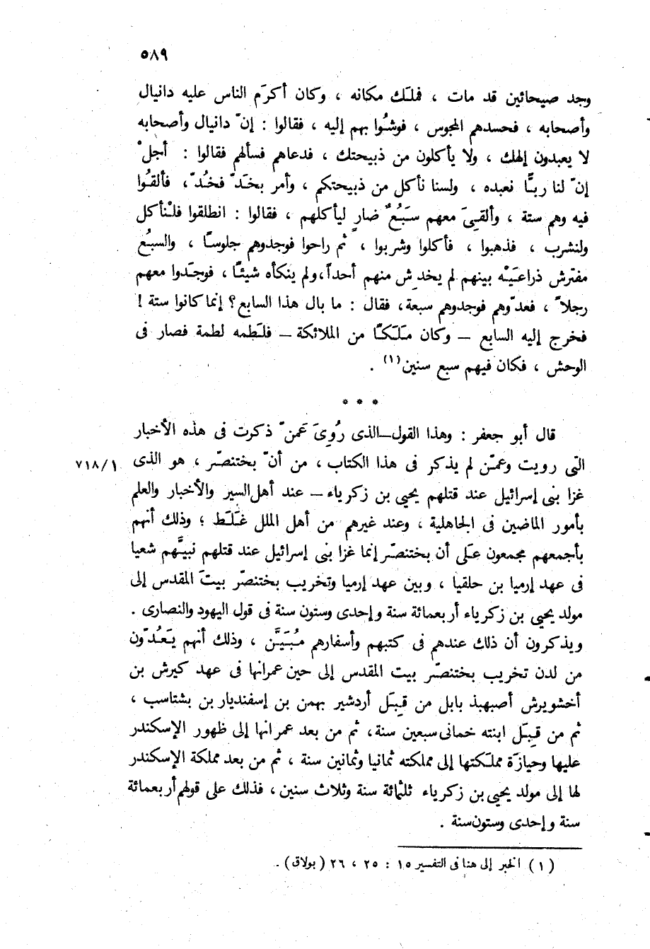 قَالَ أَبُو جَعْفَرٍ: وَهَذَا الْقَوْلُ- الَّذِي رُوِيَ عَمَّنْ ذَكَرْتُ فِي هَذِهِ الْأَخْبَارِ الَّتِي رَوَيْتُ وَعَمَّنْ لَمْ يُذْكَرْ فِي هَذَا الْكِتَابِ، مِنْ أَنَّ بُخْتَنَصَّرَ، هُوَ الَّذِي غَزَا بَنِي إِسْرَائِيلَ عِنْدَ قَتْلِهِمْ يَحْيَى بْنِ زَكَرِيَّاءَ- عِنْدَ أَهْلِ السِّيَرِ وَالْأَخْبَارِ وَالْعِلْمِ بِأُمُورِ الْمَاضِينَ فِي الْجَاهِلِيَّةِ، وَعِنْدَ غَيْرِهِمْ مِنْ أَهْلِ الْمِلَلِ غَلَطٌ، وَذَلِكَ أَنَّهُمْ بِأَجْمَعِهِمْ مُجْمِعُونَ عَلَى أَنَّ بُخْتَنَصَّرَ إِنَّمَا غَزَا بَنِي إِسْرَائِيلَ عِنْدَ قَتْلِهِمْ نَبِيَّهُمْ شَعْيَا فِي عَهْدِ إِرْمِيَا بْنِ حلقِيَا، وَبَيْنَ عَهْدِ إِرْمِيَا وَتَخْرِيبِ بُخْتَنَصَّرَ بَيْتِ الْمَقْدِسِ إِلَى مَوْلِدِ يَحْيَى بن زكرياء أربعمائة سَنَةٍ وَإِحْدَى وَسِتُّونَ سَنَةً فِي قَوْلِ الْيَهُودِ وَالنَّصَارَى وَيَذْكُرُونَ أَنَّ ذَلِكَ عِنْدَهُمْ فِي كُتُبِهِمْ وَأَسْفَارِهِمْ مُبَيَّنٌ، وَذَلِكَ أَنَّهُمْ يَعُدُّونَ مِنْ لَدُنْ تَخْرِيبِ بُخْتَنَصَّرَ بَيْتِ الْمَقْدِسِ إِلَى حِينِ عُمْرَانِهَا فِي عَهْدِ كيرشَ بْنِ أَخْشويرشَ أَصْبهبذَ بَابِلَ مِنْ قِبَلِ أَرْدِشِيرَ بهمن بْنِ إِسْفندِيَارِ بْنِ بشتَاسبَ، ثُمَّ مِنْ قِبَلِ ابْنَتِهِ خماني سَبْعِينَ سَنَةً، ثُمَّ مِنْ بَعْدِ عُمْرَانِهَا إِلَى ظُهُورِ الإِسْكَنْدَرِ عَلَيْهَا وَحِيَازَةِ مَمْلَكَتِهَا إِلَى مَمْلَكَتِهِ ثَمَانِيًا وَثَمَانِينَ سَنَةً، ثُمَّ مِنْ بَعْدِ مَمْلَكَةِ الإِسْكَنْدَرِ لها الى مولد يحيى بن زكرياء ثلاثمائة سنه وثلاث سنين، فذلك على قولهم أربعمائة سَنَةٍ وَإِحْدَى وَسِتُّونَ سَنَةً