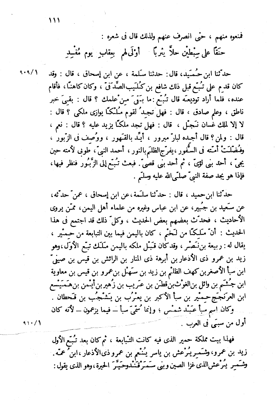 حَدَّثَنَا ابن حميد، قال: حَدَّثَنَا سلمة، عن ابْنِ إِسْحَاقَ، عَمَّنْ حَدَّثَهُ، عَنْ سَعِيدِ بْنِ جُبَيْرٍ، عَنِ ابْنِ عَبَّاسٍ وَغَيْرِهِ مِنْ عُلَمَاءِ أَهْلِ الْيَمَنِ، مِمَّنْ يَرْوِي الأَحَادِيثَ، فَحَدَّثَ بَعْضُهُمْ بَعْضَ الْحَدِيثِ، وَكُلُّ ذَلِكَ قَدِ اجْتَمَعَ فِي هَذَا الْحَدِيثِ: أَنَّ مَلِكًا مِنْ لَخْمٍ، كَانَ بِالْيَمَنِ فِيمَا بَيْنَ التَّبَابِعَةِ مِنْ حِمْيَر، يُقَالُ لَهُ: رَبِيعَةُ بْنُ نَصْرٍ، وَقَدْ كَانَ قَبْلَ مُلْكِهِ بِالْيَمَنِ مُلْكُ تُبَّعٍ الأَوَّلِ، وَهُوَ زَيْدُ بْنُ عَمْرٍو ذِي الأَذْعَارِ بْنِ أَبْرَهَةَ ذِي المنار بن الرائش بن قيس بن صيفي ابن سَبَإٍ الأَصْغَرِ بْنِ كَهْفِ الظُّلْمِ بْنِ زَيْدِ بْنِ سَهْلِ بْنِ عَمْرِو بْنِ قَيْسِ بْنِ معاويه ابن جُشْمِ بْنِ وَائِلِ بْنِ الْغَوْثِ بْنِ قَطَنِ بْنِ عُرَيْبِ بْنِ زُهَيْرِ بْنِ أَيْمَنَ بْنِ هُمَيْسِعِ ابْنِ الْعَرَنْجَجِ حِمْيَرِ بْنِ سَبَإٍ الأَكْبَرِ بن يَعْرُبَ بْنِ يَشْجُبَ بْنِ قَحْطَانَ: