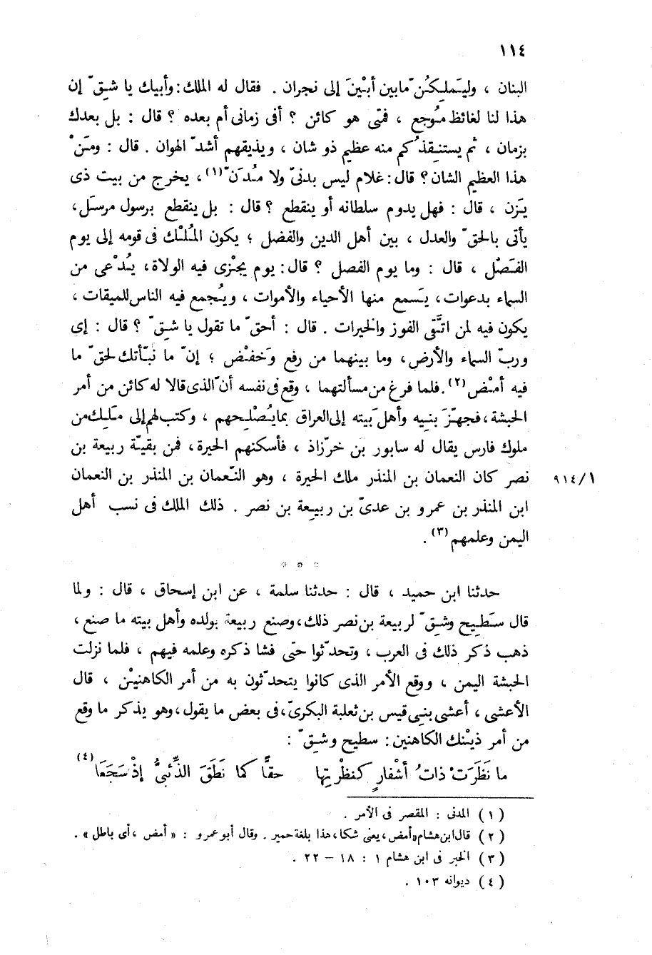 البنان، وليملكن ما بين أبين إلى نجران فقال له الملك: وأبيك يا شق إن هذا لنا لغائظ موجع، فمتى هو كائن؟ أفي زماني أم بعده؟ قَالَ: بل بعدك بزمان، ثم يستنقذكم منه عظيم ذو شأن، ويذيقهم أشد الهوان قَالَ: ومن هذا العظيم الشأن؟ قَالَ: غلام ليس بدني ولا مدن، يخرج من بيت ذي يزن، قَالَ: فهل يدوم سلطانه أو ينقطع؟ قَالَ: بل ينقطع برسول مرسل، يأتي بالحق والعدل، بين أهل الدين والفضل، يكون الملك في قومه إلى يوم الفصل، قَالَ: وما يوم الفصل؟ قَالَ: يوم يجزى فيه الولاة، يدعى من السماء بدعوات، يسمع منها الأحياء والأموات، ويجمع فيه الناس للميقات، يكون فيه لمن اتقى الفوز والخيرات قَالَ: أحق ما تقول يا شق؟ قَالَ: إي ورب السماء والأرض، وما بينهما من رفع وخفض، إن ما نبأتك لحق ما فيه أمض فلما فرغ من مسألتهما، وقع في نفسه أن الذي قالا له كائن من أمر الحبشة، فجهز بنيه وأهل بيته إلى العراق بما يصلحهم، وكتب لهم إلى ملك من ملوك فارس يقال له سابور بن خرزاذ، فأسكنهم الحيرة، فمن بقية ربيعة بن نصر كان النعمان بن المنذر ملك الحيرة، وهو النعمان بن المنذر بن النعمان ابن المنذر بن عمرو بن عدي بن ربيعة بن نصر ذلك الملك في نسب أهل اليمن وعلمهم.