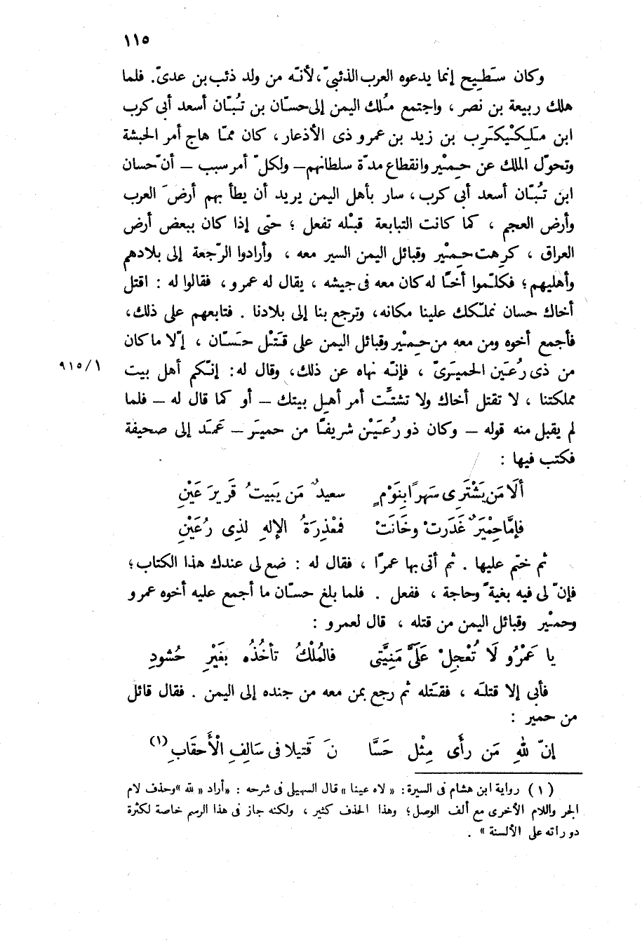 وكان سطيح إنما يدعوه العرب الذئبي، لأنه من ولد ذئب بن عدي فلما هلك ربيعة بن نصر، واجتمع ملك اليمن إلى حسان بن تبان اسعد ابى كرب ابن ملكيكرب بن زيد بن عمرو ذي الأذعار، كان مما هاج أمر الحبشة وتحول الملك عن حمير وانقطاع مدة سلطانهم- ولكل أمر سبب- ان حسان ابن تبان أسعد أبي كرب، سار بأهل اليمن يريد أن يطأ بهم أرض العرب وأرض العجم، كما كانت التبابعة قبله تفعل، حتى إذا كان ببعض أرض العراق، كرهت حمير وقبائل اليمن السير معه، وأرادوا الرجعة إلى بلادهم وأهليهم، فكلموا أخا له كان معه في جيشه، يقال له عمرو، فقالوا له: اقتل أخاك حسان نملكك علينا مكانه، وترجع بنا إلى بلادنا فتابعهم على ذلك، فأجمع أخوه ومن معه من حمير وقبائل اليمن على قتل حسان، إلا ما كان من ذي رعين الحميري، فإنه نهاه عن ذلك، وقال له: إنكم أهل بيت مملكتنا، لا تقتل أخاك ولا تشتت أمر أهل بيتك- او كما قال له- فلما لم يقبل منه قوله- وكان ذو رعين شريفا من حمير- عمد إلى صحيفة فكتب فيها: