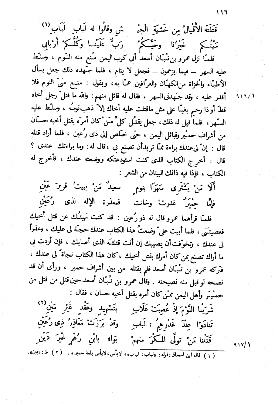 فلما قرأهما عمرو قَالَ له ذو رعين: قد كنت نهيتك عن قتل أخيك فعصيتني، فلما أبيت علي وضعت هذا الكتاب عندك حجة لي عليك، وعذرا لي عندك، وتخوفت أن يصيبك إن أنت قتلته الذي أصابك، فإن أردت بي ما أراك تصنع بمن كان أمرك بقتل أخيك، كان هذا الكتاب نجاة لي عندك، فتركه عمرو بن تبان أسعد فلم يقتله من بين أشراف حمير، ورأى أن قد نصحه لو قبل منه نصيحته وقال عمرو بن تبان أسعد حين قتل من قتل من حمير وأهل اليمن ممن كان أمره بقتل أخيه حسان، فقال: