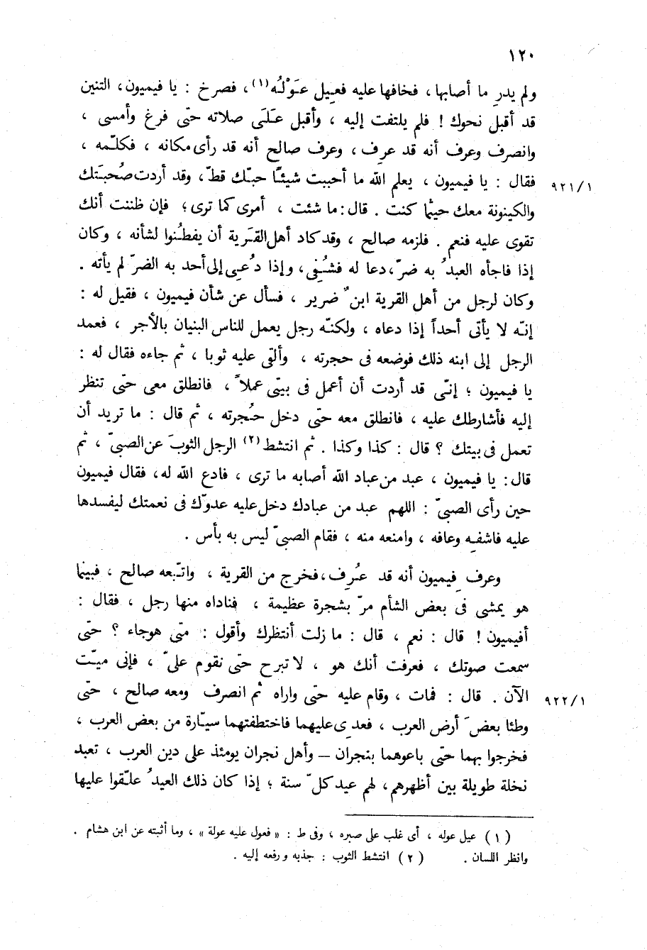 أفيميون! قَالَ: نعم، قَالَ: ما زلت أنتظرك وأقول: متى هو جاء، حتى سمعت صوتك، فعرفت أنك هو، لا تبرح حتى نقوم علي، فإني ميت الآن قَالَ: فمات، وقام عليه حتى واراه ثم انصرف ومعه صالح، حتى وطئا بعض أرض العرب، فعدى عليهما فاختطفتهما سيارة من بعض العرب، فخرجوا بهما حتى باعوهما بنجران- وأهل نجران يومئذ على دين العرب، تعبد نخلة طويلة بين أظهرهم، لهم عيد كل سنة، إذا كان ذلك العيد علقوا عليها