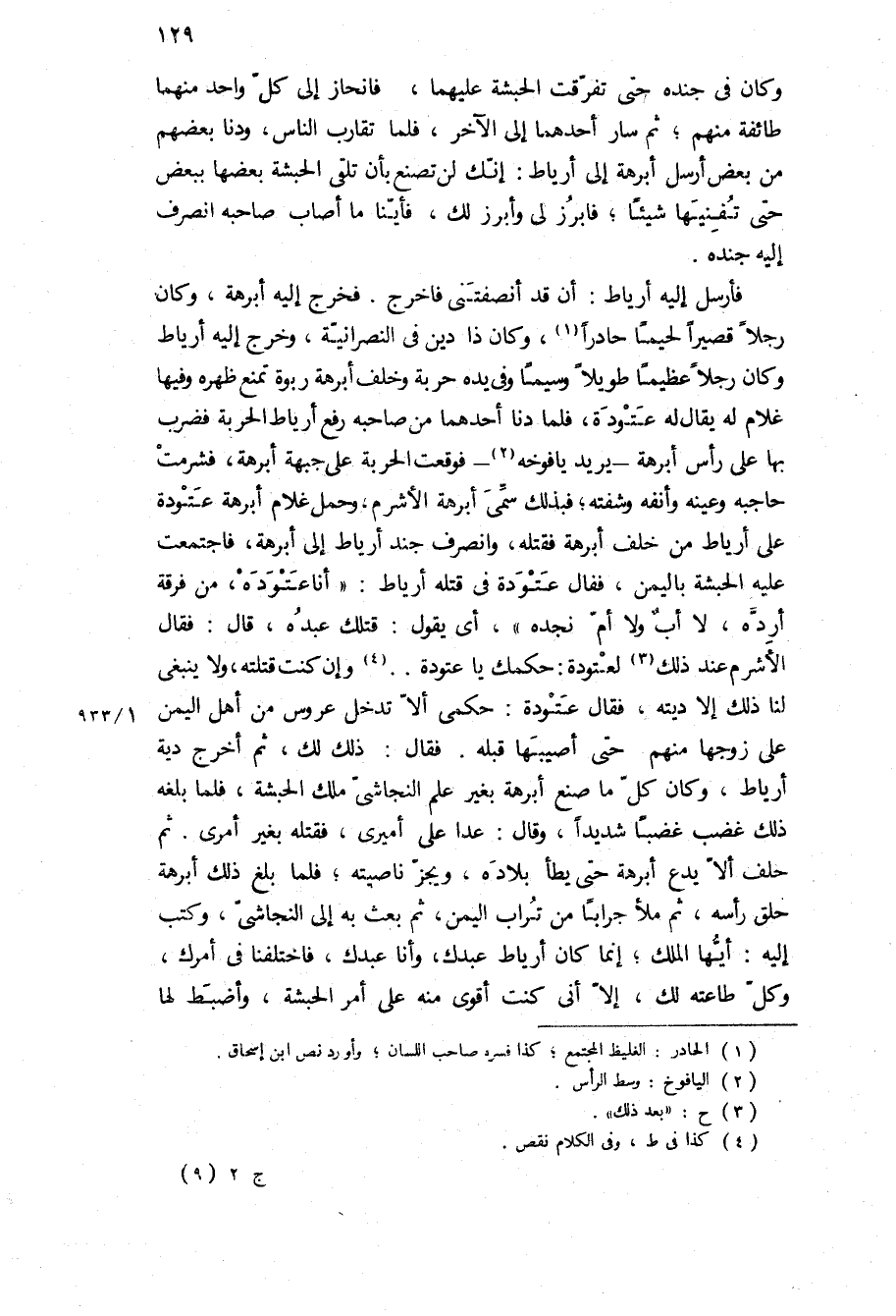 فأرسل إليه أرياط: أن قد أنصفتني فاخرج فخرج إليه أبرهة، وكان رجلا قصيرا لحيما حادرا، وكان ذا دين في النصرانية، وخرج إليه أرياط وكان رجلا عظيما طويلا وسيما وفي يده حربة وخلف أبرهة ربوة تمنع ظهره وفيها غلام له يقال له عتودة، فلما دنا أحدهما من صاحبه رفع أرياط الحربة فضرب بها على رأس أبرهة- يريد يافوخه- فوقعت الحربة على جبهة أبرهة، فشرمت حاجبه وعينه وأنفه وشفته، فبذلك سمي أبرهة الأشرم وحمل غلام أبرهة عتودة على ارياط من خلف أبرهة فقتله، وانصرف جند أرياط إلى أبرهة، فاجتمعت عليه الحبشة باليمن، فقال عتودة في قتله ارياط: أنا عتودة، من فرقة أردة، لا أب ولا أم نجده، أي يقول: قتلك عبده، قَالَ: فقال الأشرم عند ذلك لعتودة: حكمك يا عتودة وإن كنت قتلته، ولا ينبغي لنا ذلك إلا ديته، فقال عتودة: حكمي ألا تدخل عروس من أهل اليمن على زوجها منهم حتى أصيبها قبله فقال: ذلك لك، ثم أخرج دية أرياط، وكان كل ما صنع أبرهة بغير علم النجاشي ملك الحبشة، فلما بلغه ذلك غضب غضبا شديدا، وقال: عدا على أميري، فقتله بغير أمري ثم حلف ألا يدع أبرهة حتى يطأ بلاده، ويجز ناصيته، فلما بلغ ذلك أبرهة حلق رأسه، ثم ملأ جرابا من تراب اليمن، ثم بعث به إلى النجاشي، وكتب إليه: أيها الملك، إنما كان ارياط عبدك، وأنا عبدك، فاختلفنا في أمرك، وكل طاعته لك، إلا أني كنت أقوى منه على أمر الحبشة، وأضبط لها