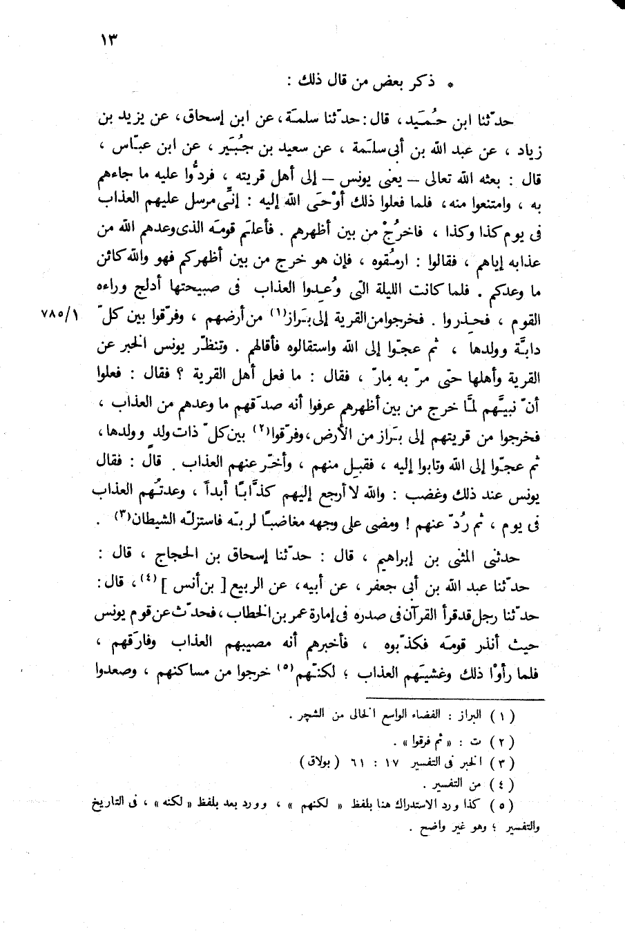 حَدَّثَنَا ابْنُ حميد، قال: حَدَّثَنَا سَلَمَةُ، عَنِ ابْنِ إِسْحَاقَ، عَنْ يَزِيدَ بْنِ زِيَادٍ، عَنْ عَبْدِ اللَّهِ بْنِ أَبِي سَلَمَةَ، عَنْ سَعِيدِ بْنِ جُبَيْرٍ، عَنِ ابْنِ عَبَّاسٍ، قَالَ: بَعَثَهُ اللَّهُ تَعَالَى- يَعْنِي يُونُسَ- إِلَى أَهْلِ قَرْيَتِهِ، فَرَدُّوا عَلَيْهِ مَا جَاءَهَمْ بِهِ، وَامْتَنَعُوا مِنْهُ، فَلَمَّا فَعَلُوا ذَلِكَ أَوْحَى اللَّهُ إِلَيْهِ: أَنِّي مُرْسِلٌ عَلَيْهِمُ الْعَذَابَ فِي يَوْمِ كَذَا وَكَذَا، فَاخْرُجْ مِنْ بَيْنَ أَظْهُرِهِمْ فَأَعْلَمَ قَوْمَهُ الَّذِي وَعَدَهُمُ اللَّهُ مِنْ عَذَابِهِ إِيَّاهُمْ، فَقَالُوا: ارْمِقُوهُ، فَإِنْ هُوَ خَرَجَ مِنْ بَيْنَ أَظْهُرِكُمْ فَهُوَ وَاللَّهِ كَائِنٌ مَا وَعَدَكُمْ فَلَمَّا كَانَتِ اللَّيْلَةُ الَّتِي وُعِدُوا العذاب في صبيحتها ادلج وراءه الْقَوْمُ، فَحَذِرُوا فَخَرَجُوا مِنَ الْقَرْيَةِ إِلَى بَرَازٍ مِنْ أَرْضِهِمْ، وَفَرَّقُوا بَيْنَ كُلِّ دَابَّةٍ وَوَلَدِهَا، ثُمَّ عَجُّوا إِلَى اللَّهِ وَاسْتَقَالُوهُ فَأَقَالَهُمْ وَتَنَظَّرَ يُونُسُ الْخَبَرَ عَنِ الْقَرْيَةِ وَأَهْلِهَا حَتَّى مَرَّ بِهِ مَارٌّ، فَقَالَ: مَا فَعَلَ أَهْلُ الْقَرْيَةِ؟ فقال: فَعَلُوا أَنَّ نَبِيَّهُمْ لَمَّا خَرَجَ مِنْ بَيْنَ أَظْهُرِهِمْ عَرَفُوا أَنَّهُ صَدَقَهُمْ مَا وَعَدَهُمْ مِنَ الْعَذَابِ، فَخَرَجُوا مِنْ قَرْيَتِهِمْ إِلَى بَرَازٍ مِنَ الأَرْضِ، وَفَرَّقُوا بَيْنَ كُلِّ ذَاتِ وَلَدٍ وَوَلَدِهَا، ثُمَّ عَجُّوا إِلَى اللَّهِ وَتَابُوا إِلَيْهِ، فَقَبِلَ مِنْهُمْ، وَأَخَّرَ عَنْهُمُ الْعَذَابَ قَالَ: فَقَالَ يُونُسُ عِنْدَ ذَلِكَ وَغَضِبَ: وَاللَّهِ لا أَرْجِعُ إِلَيْهِمْ كَذَّابًا أَبَدًا، وَعَدْتُهُمُ الْعَذَابَ فِي يَوْمٍ، ثُمَّ رُدَّ عَنْهُمْ! وَمَضَى عَلَى وَجْهِهِ مُغَاضِبًا لِرَبِّهِ فَاسْتَزَلَّهُ الشَّيْطَانُ.