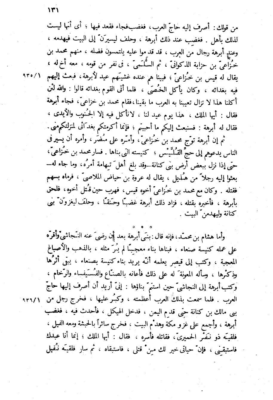 وأما هشام بن مُحَمَّد، فإنه قَالَ: بنى أبرهة بعد أن رضي عنه النجاشي وأقره على عمله كنيسة صنعاء، فبناها بناء معجبا لم ير مثله، بالذهب والأصباغ المعجبة، وكتب إلى قيصر يعلمه أنه يريد بناء كنيسة بصنعاء، يبقى أثرها وذكرها، وسأله المعونة له على ذلك فأعانه بالصناع والفسيفساء والرخام، وكتب أبرهة إلى النجاشي حين استتم بناؤها: إني أريد أن أصرف إليها حاج العرب فلما سمعت بذلك العرب أعظمته، وكبر عليها، فخرج رجل من بني مالك بن كنانة حتى قدم اليمن، فدخل الهيكل، فأحدث فيه، فغضب أبرهة، وأجمع على غزو مكة وهدم البيت، فخرج سائرا بالحبشة ومعه الفيل، فلقيه ذو نفر الحميري، فقاتله فأسره، فقال: أيها الملك، إنما أنا عبدك فاستبقني، فإن حياتي خير لك من قتلي، فاستبقاه، ثم سار فلقيه نفيل